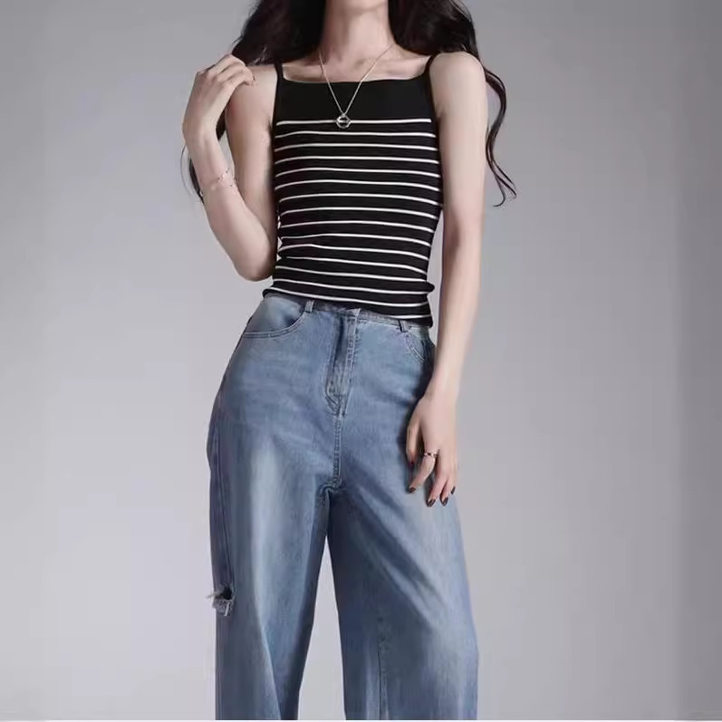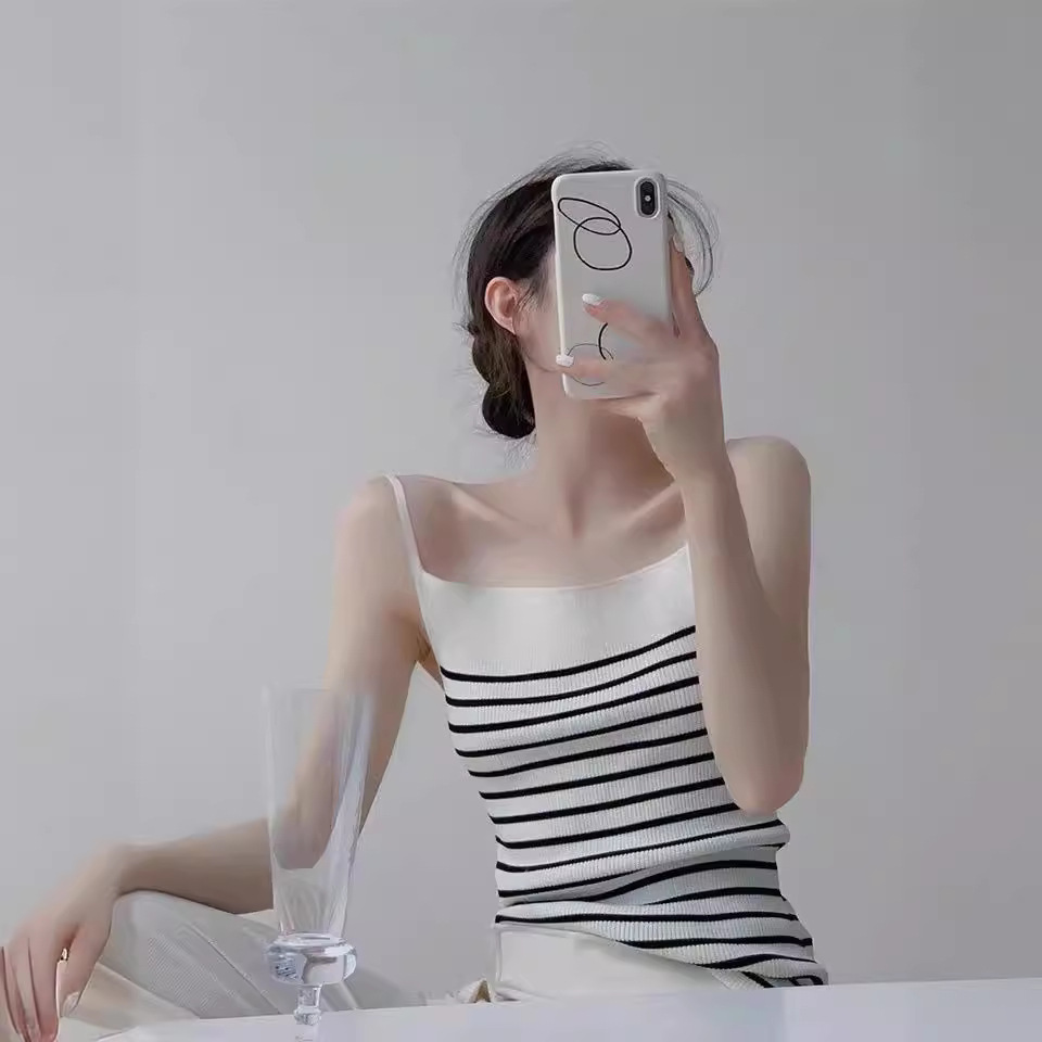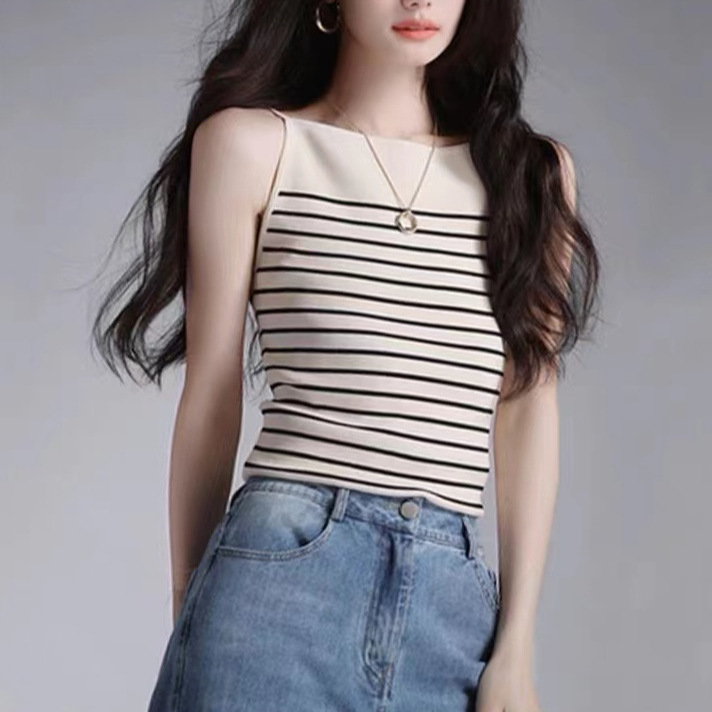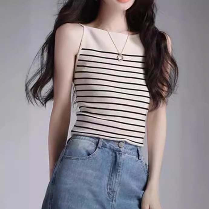 | nameOriginal | Hong Kong Style Vintage Striped Camisole Women's Outer Wear Summer One-character Collar Beautiful Back Elegant Inner Knitted Short Top |