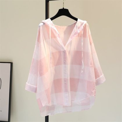 | nameOriginal | Hooded drawstring plaid cotton and linen sun protection clothing shirt for women 2024 spring and summer Korean style loose casual thin cardigan shirt |