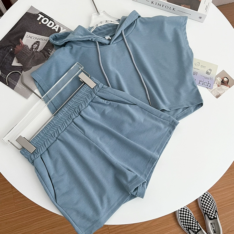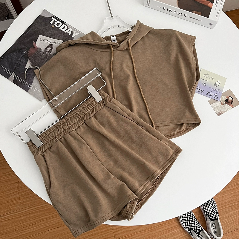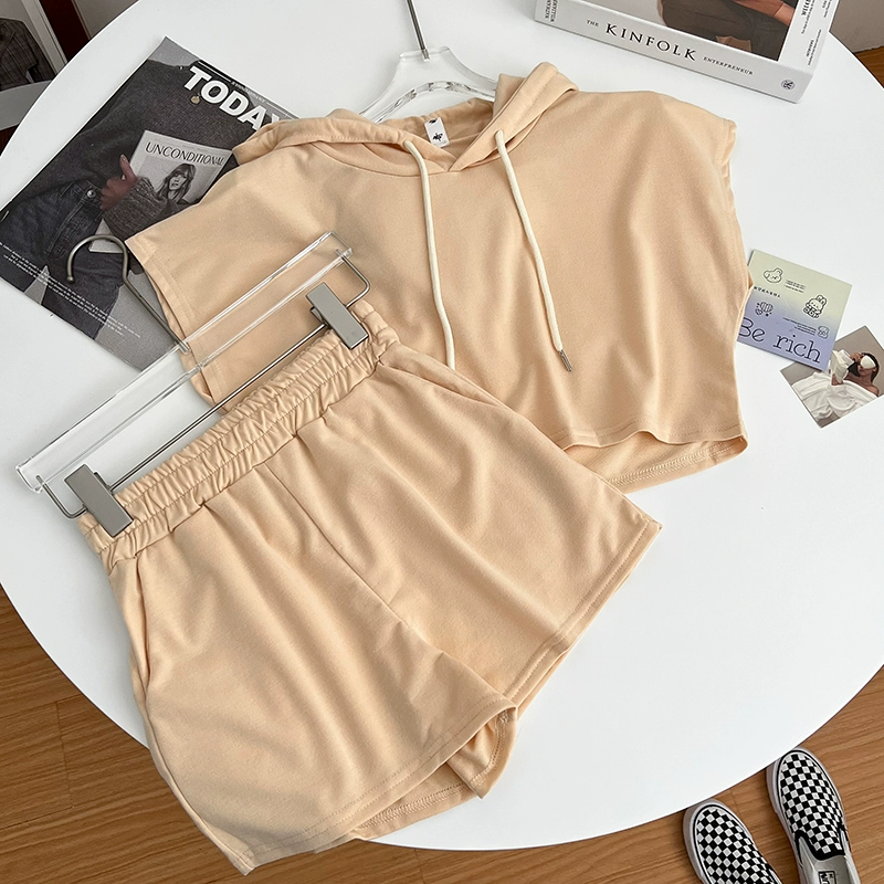 Hooded drawstring sleeveless short sweatshirt + elastic waist wide leg pants casual pants sports two-piece set women's summer new style