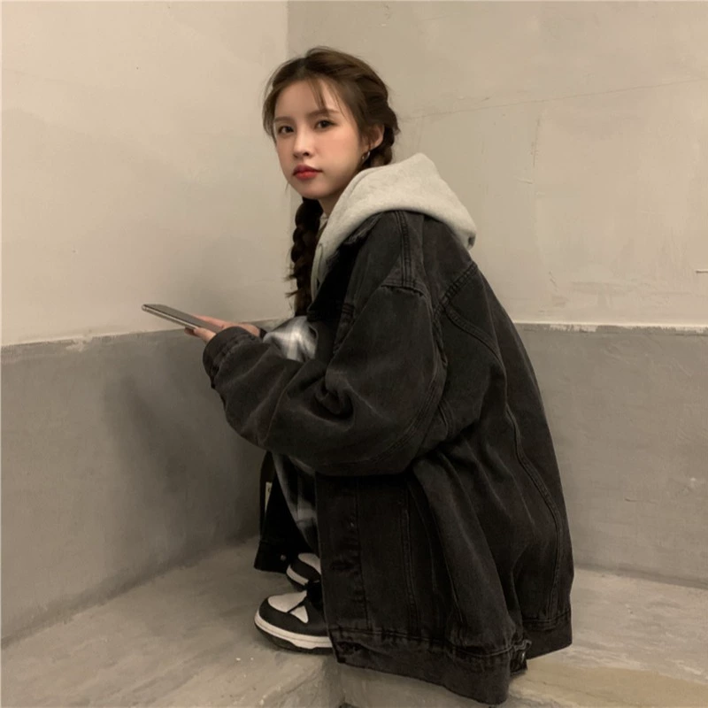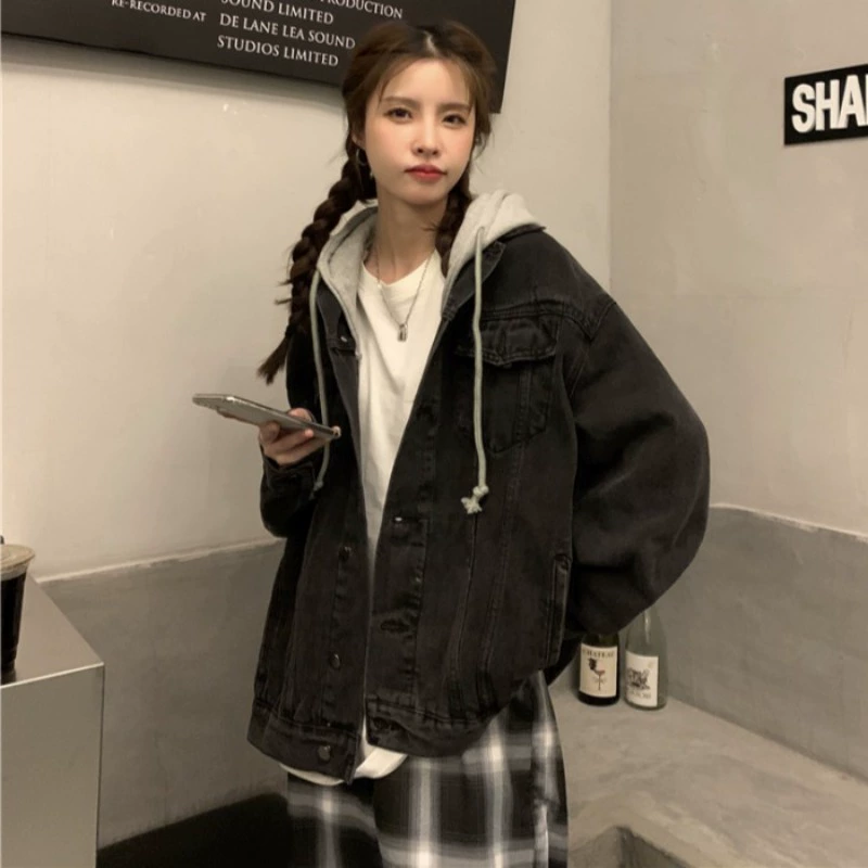 Hooded fake two-piece denim jacket 2024 new women's spring and autumn design niche loose bf style casual jacket