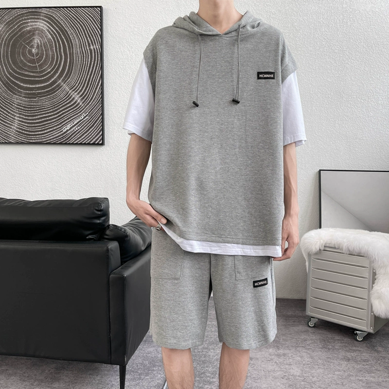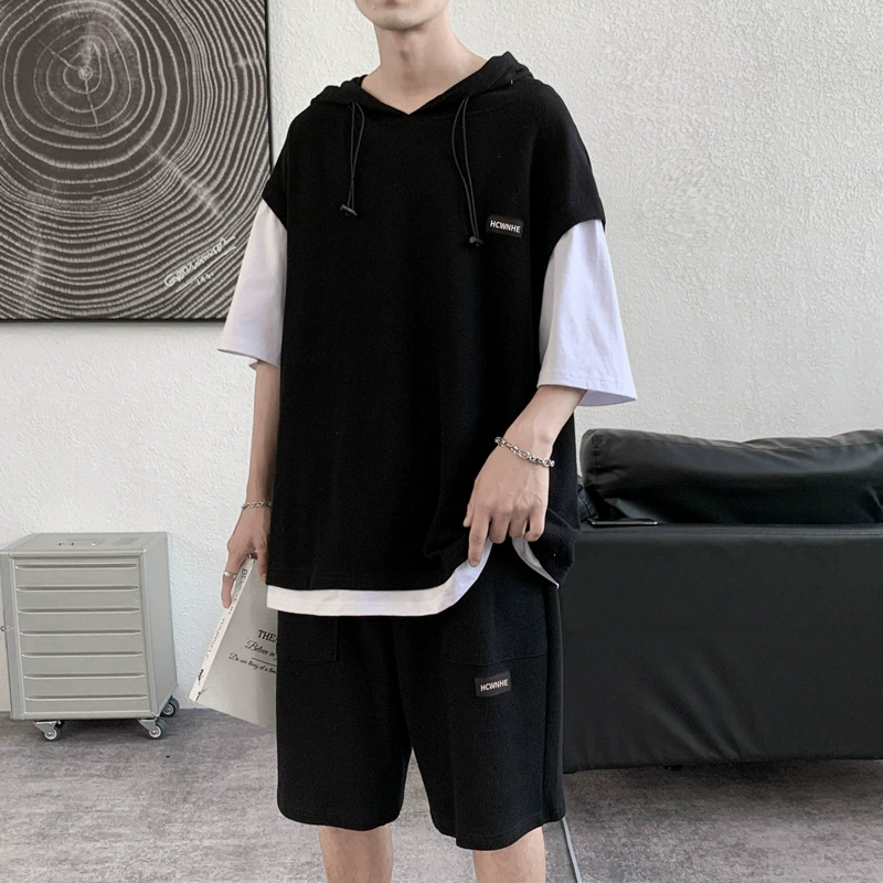 | nameOriginal | Hooded fake two-piece three-quarter sleeve T-shirt suit for men in summer, street student handsome basketball sports shorts two-piece set |