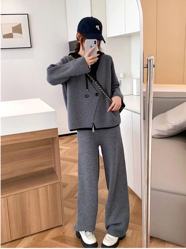| nameOriginal | Hooded knitted suit women's 2023 autumn and winter Korean style design lazy style fake two-piece coat wide leg pants two-piece suit |