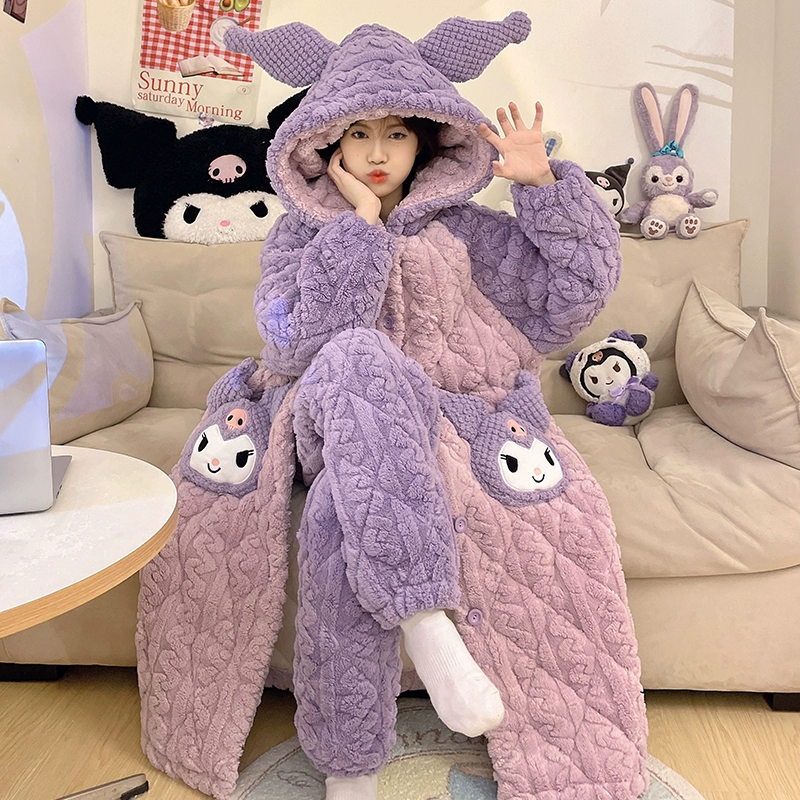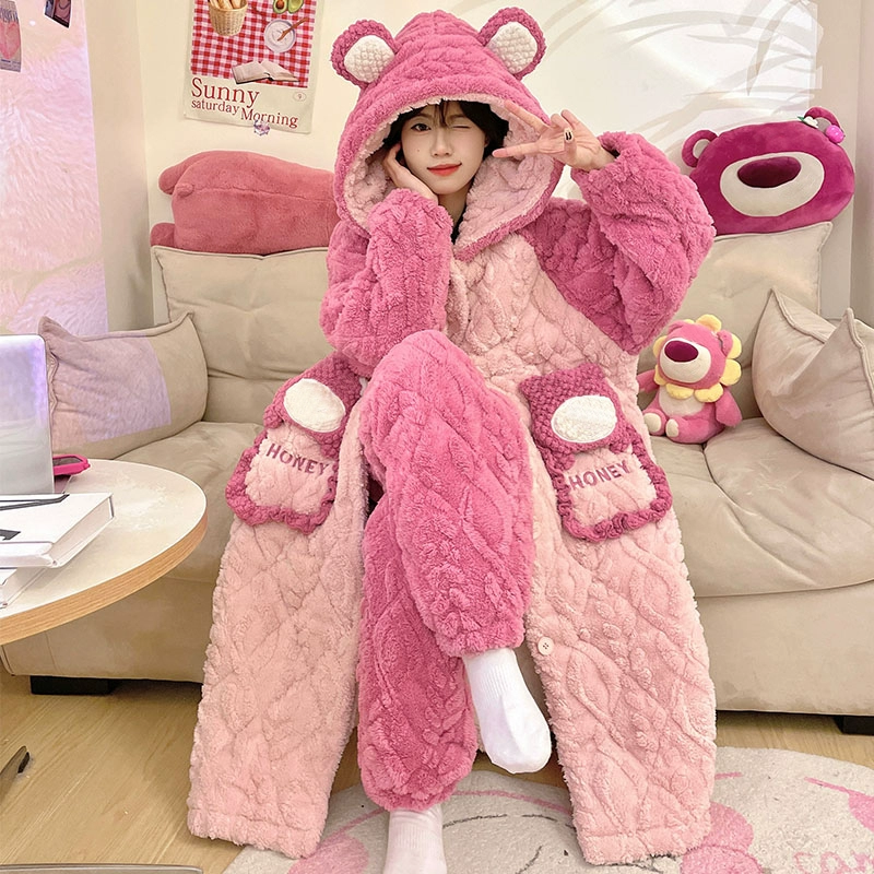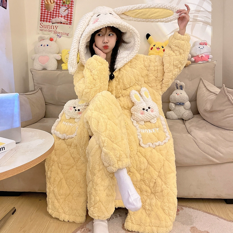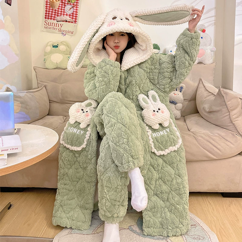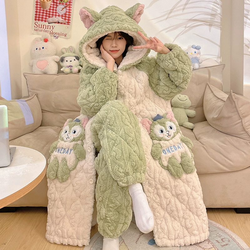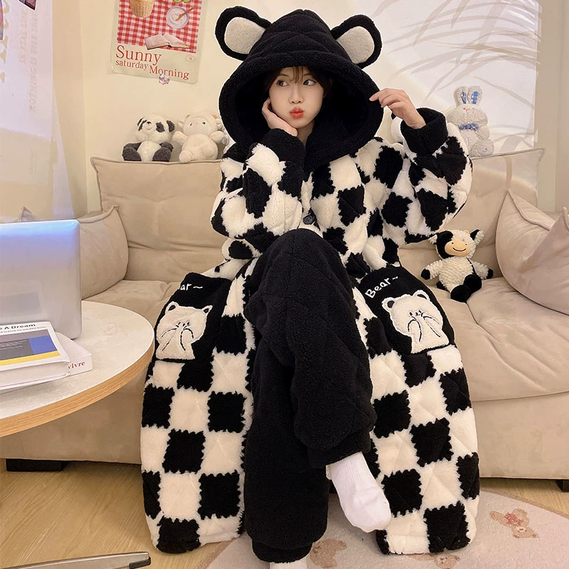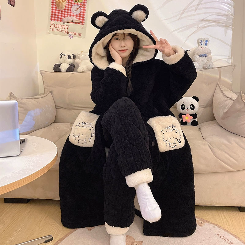 Hooded nightgown winter velvet thickened pajamas for women 2023 new three-layer quilted coral velvet home wear set