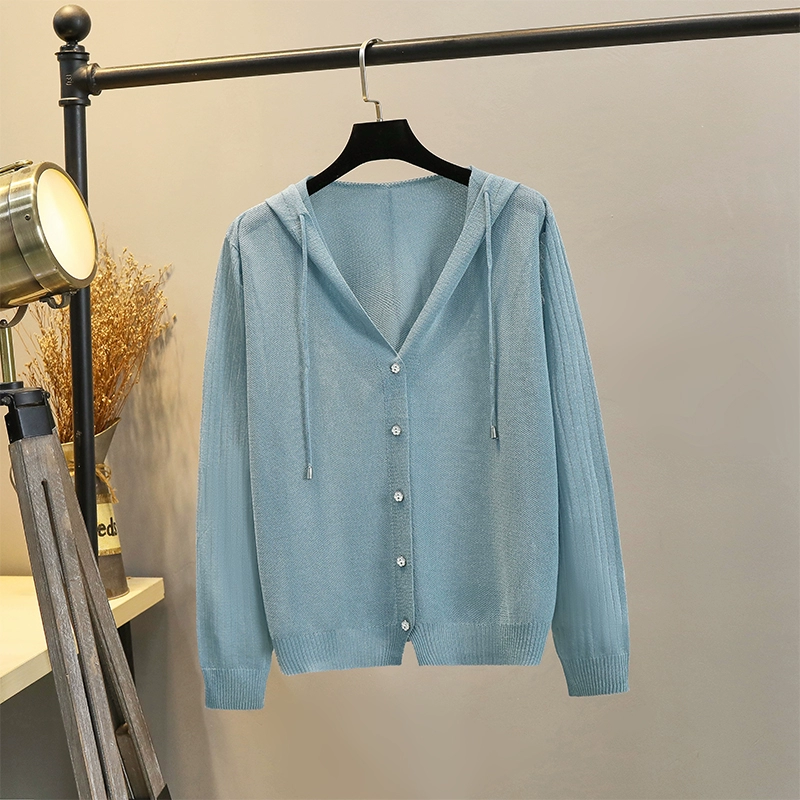 | nameOriginal | Hooded sunscreen air-conditioned cardigan for women ice silk knitted summer long-sleeved thin loose large size shawl coat belt |