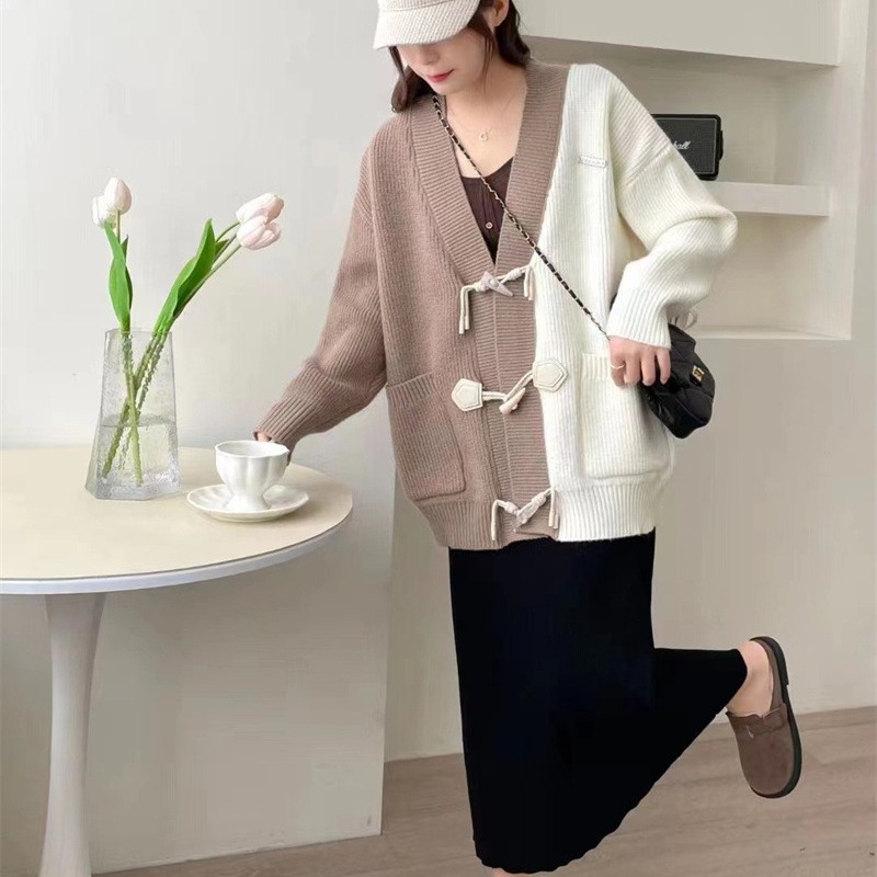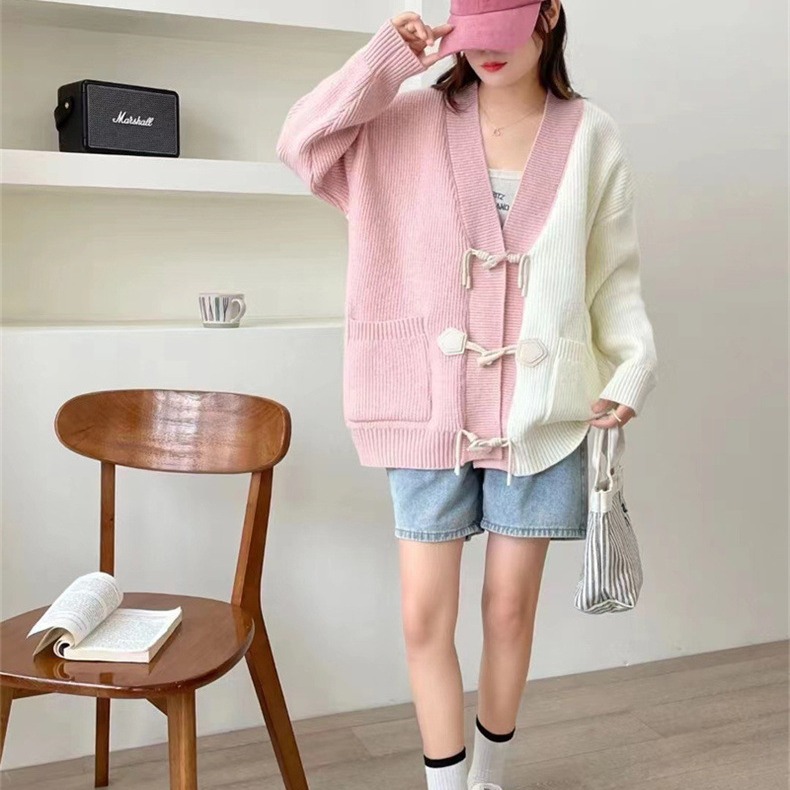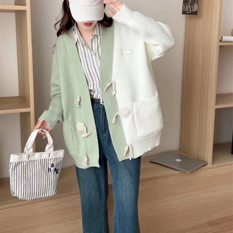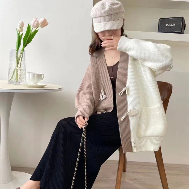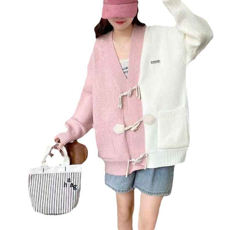 | nameOriginal | Horn buckle contrast color V-neck knitted cardigan sweater for women Spring and Autumn 2024 New sweet loose slimming lazy coat |