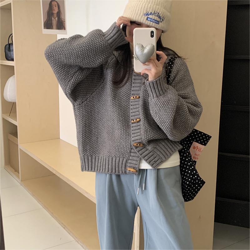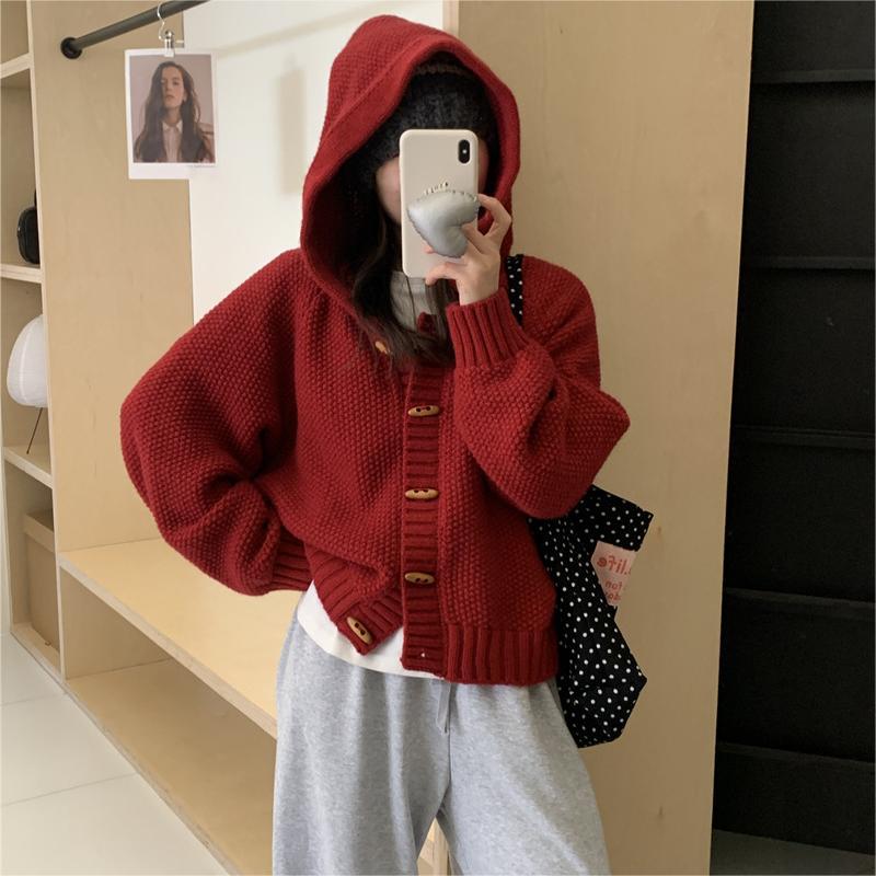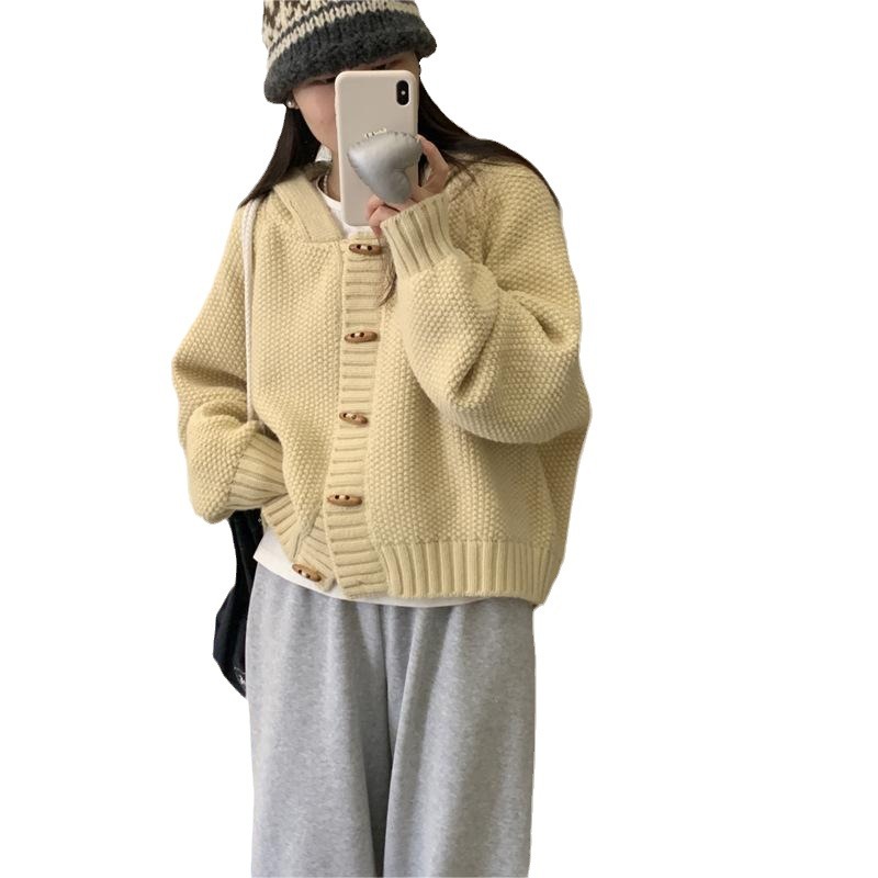 Horn buckle hooded knitted cardigan coat for women Spring New lazy style loose solid color design outer wear top