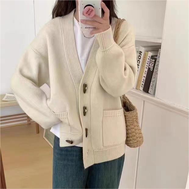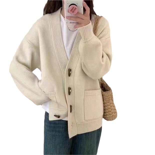 Horns Knitted Cardigan Top Women’s 2024 Autumn and Winter New Soft Waxy Loose Korean V-neck Outer Wear Sweater Jacket