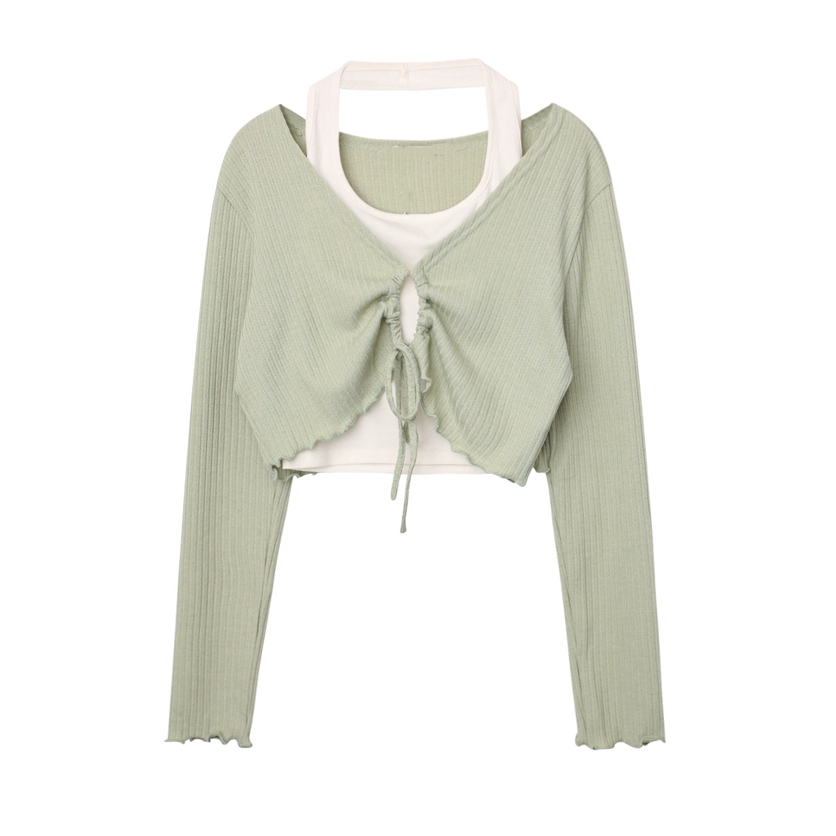 Hot girl bm short T-shirt niche design sense two-piece set halter neck vest long sleeve top 2023 spring new women