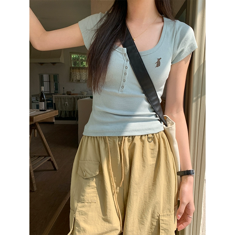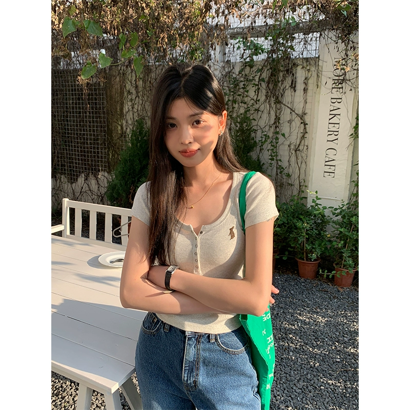 Hot Girl Petite Right Shoulder Embroidered Slim Fit Short Sleeve T-Shirt