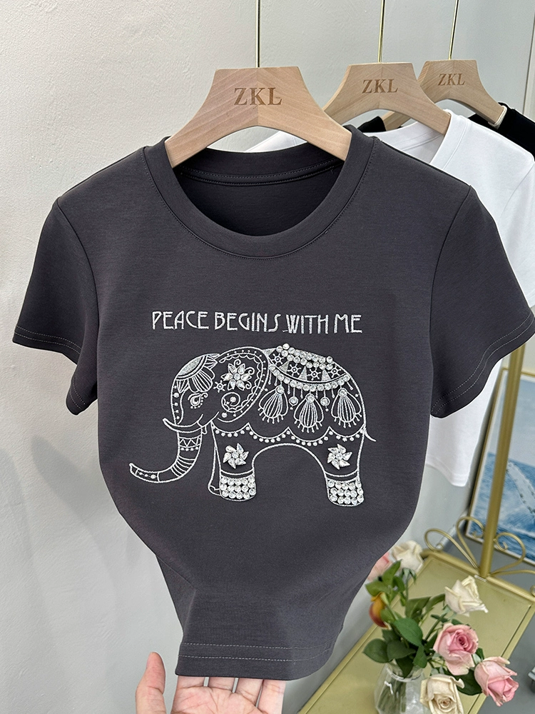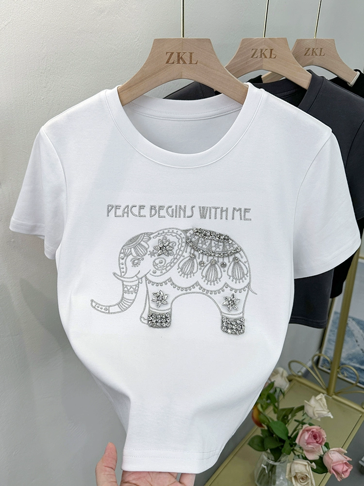Hot girl sexy round neck short-sleeved T-shirt summer high-end elephant silver embroidered short top for little people