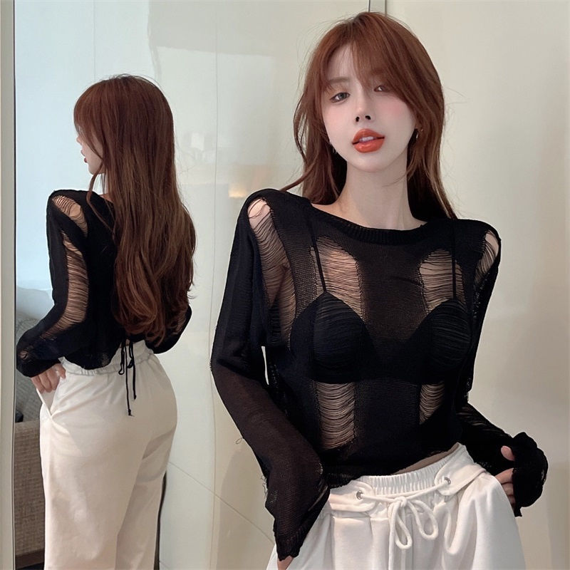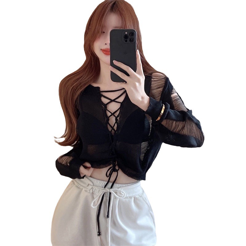 Hot Girls Hollow Strap Knitwear Women’s Instagram Style Summer New Korean-style Long-sleeved Short Micro-transparent Sunscreen Blouse Top