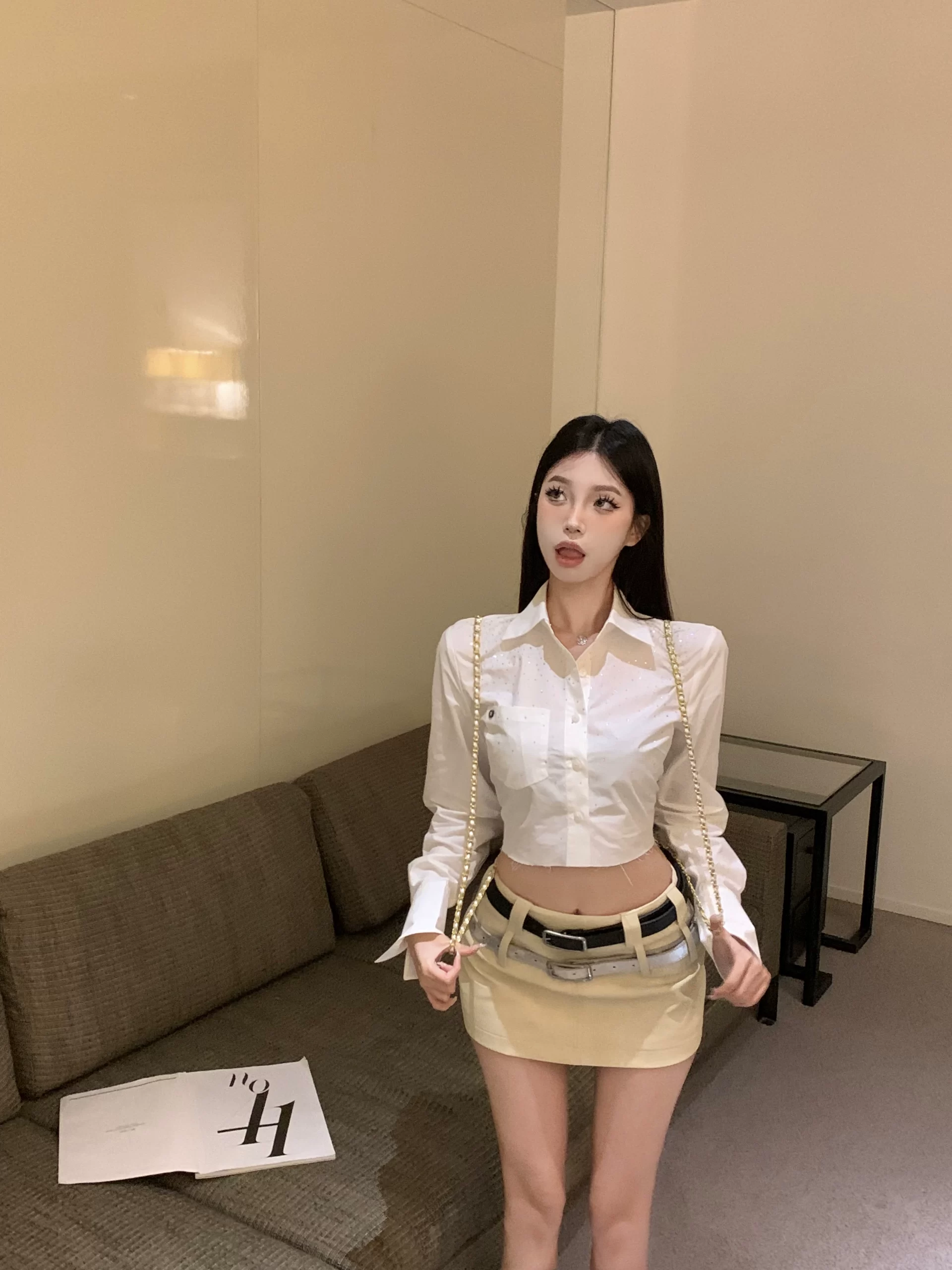 | nameOriginal | Hot girl's slim-fitting navel-exposed heavy-duty hot-drilled long-sleeved shirt |