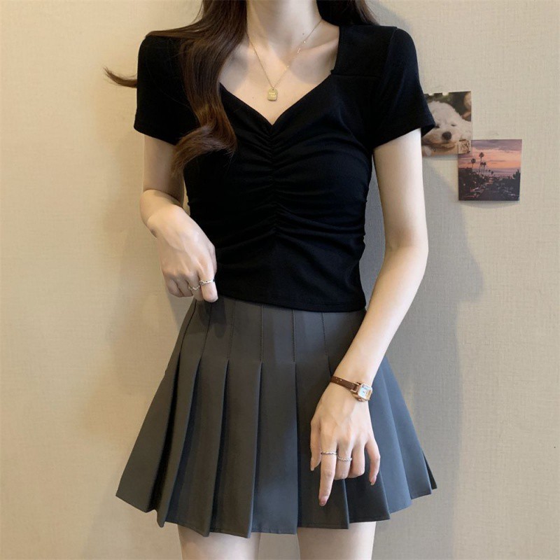 Hot Girls Square Collar Large Neck Shoulder Short-sleeved T-shirt Women's Summer Tight-fitting Slim-fit High Waist Navel-exposed Pleated Short Top