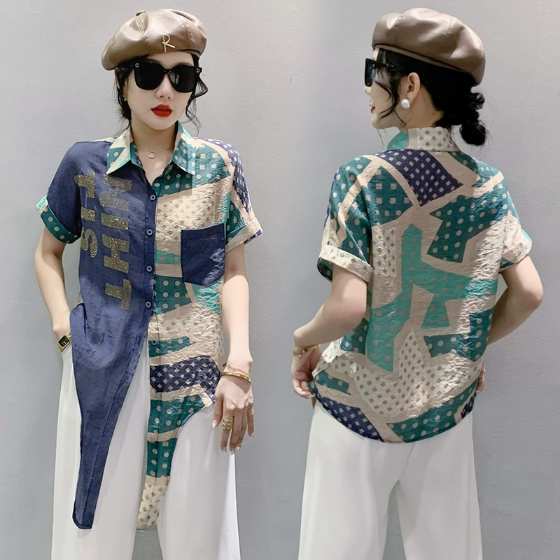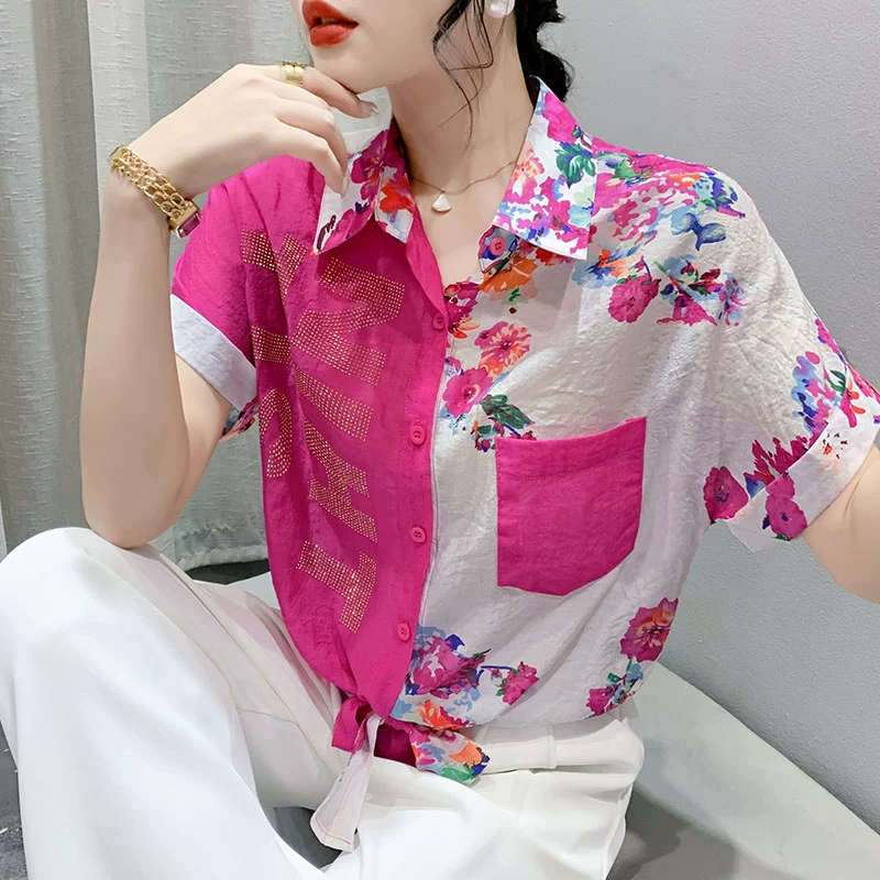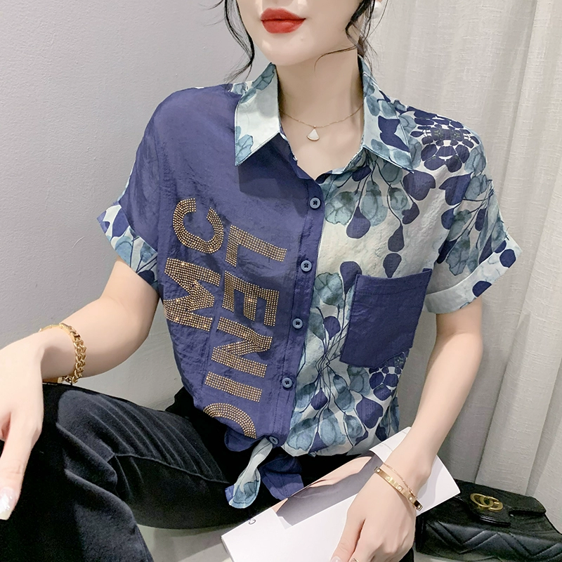 Hot rhinestone loose hem knotted fashionable short-sleeved shirt