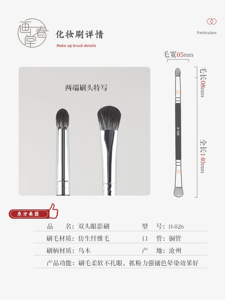 | nameOriginal | Huachuntang H026 double-ended eye shadow brush for blending and coloring details. Use small eye makeup brushes at both ends. |