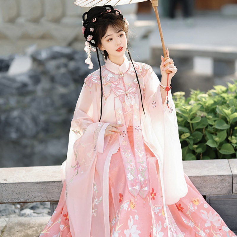 Huamisheng Original Hanfu Women’s Ancient Dress Pink Ming Cloud Shoulder Collar Pair Long Shirt Chinese Style Spring and Summer Dress