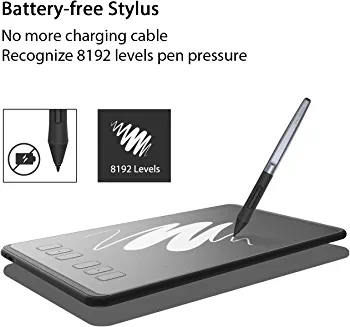 The H640P has six customized express keys that are convenient to save your favorite shortcuts, and it is also our first tablet to feature a battery-free stylus. No more charging cable needed.