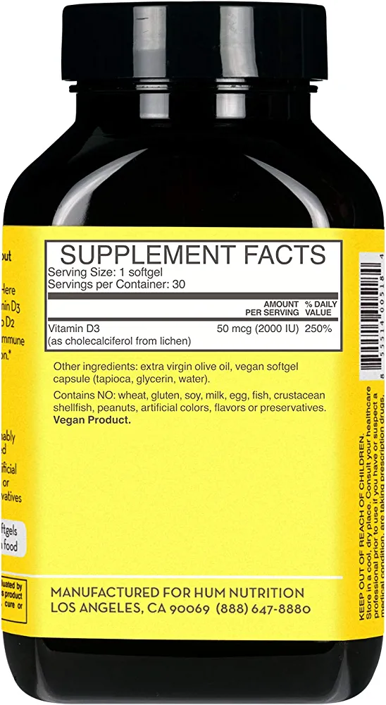 | nameOriginal | HUM Here Comes The Sun – Immune Support Supplement – 2000 IU Vitamin D3 to Support Radiant Skin, Mood, Bone Health & Immunity – Highly Potent, Vegan Formula (30 Softgels) |