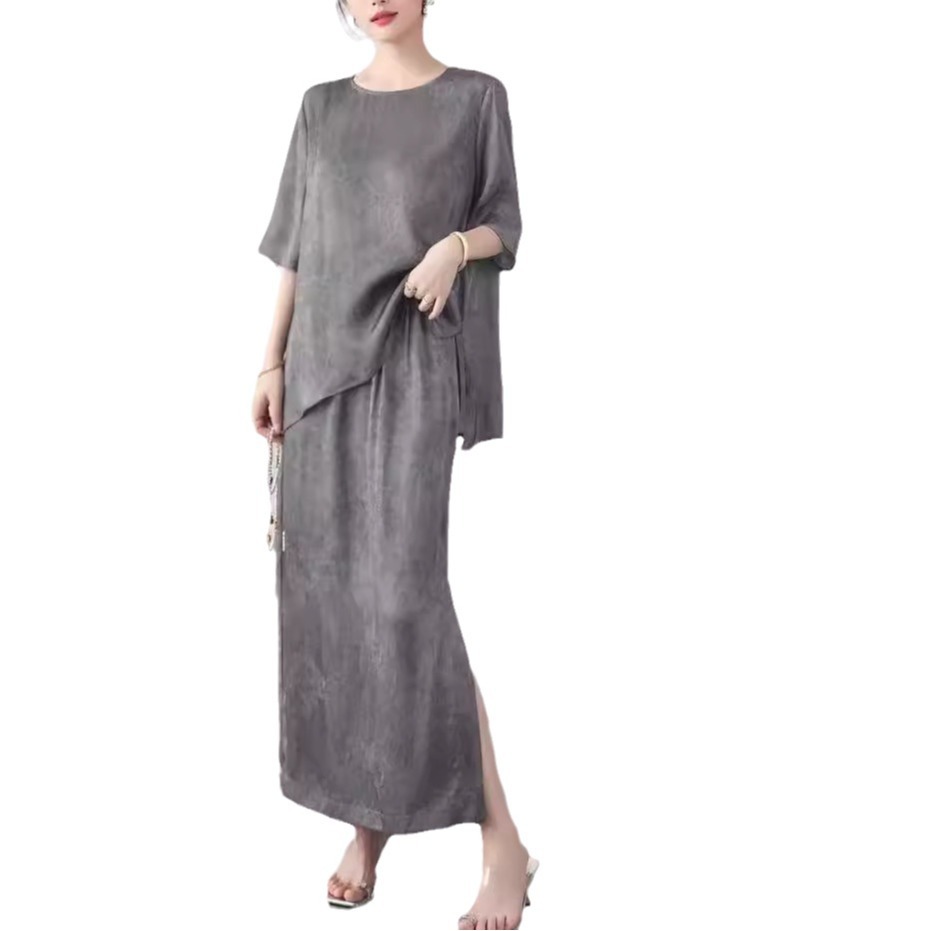 | nameOriginal | Human silk jacquard fried color fabric round neck hem irregular design simple versatile retro summer short sleeve top |