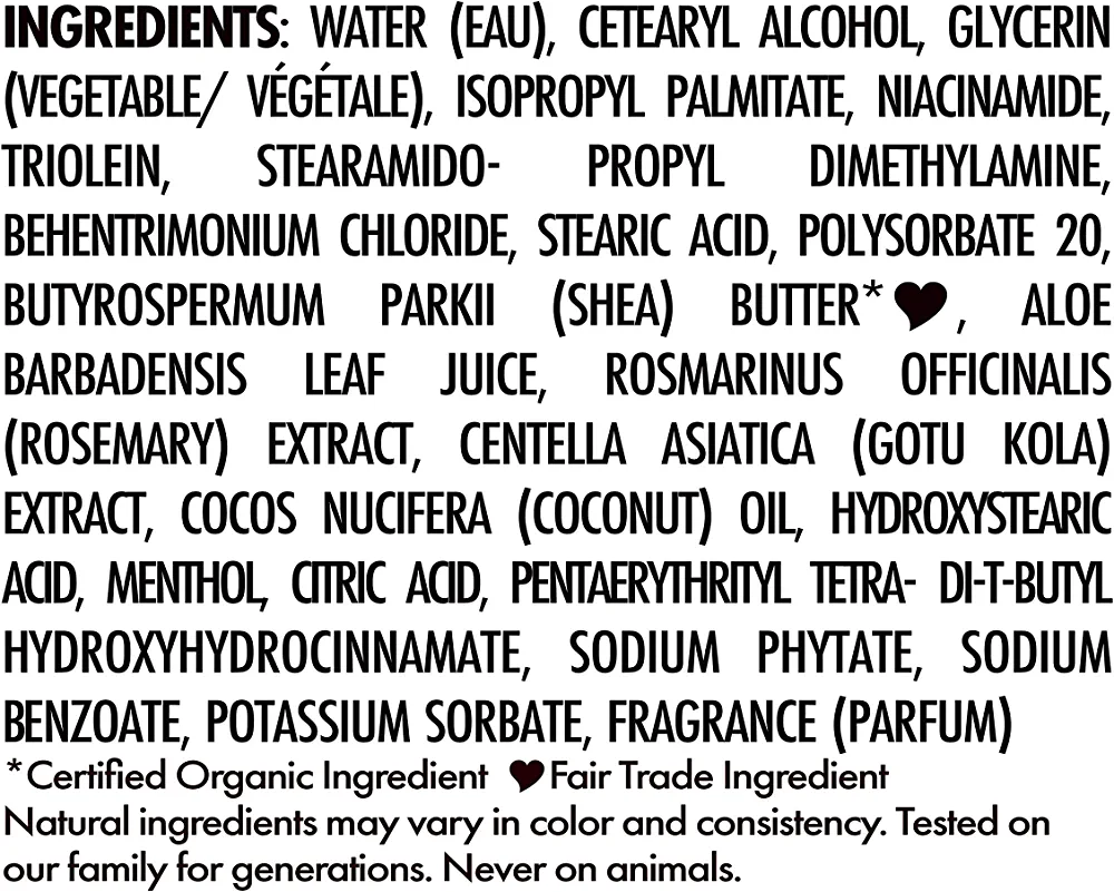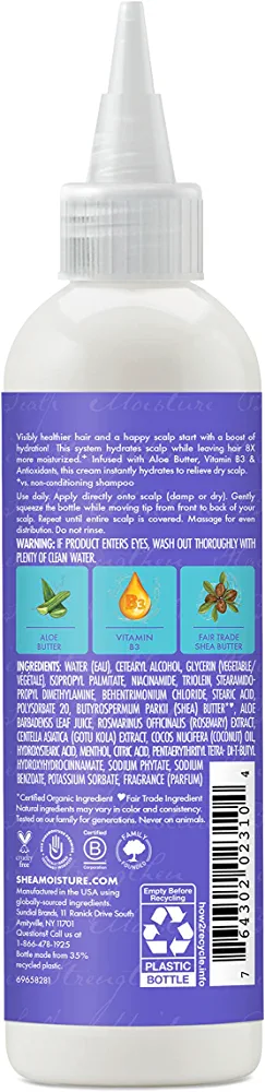 Quench your hair’s thirst with SheaMoisture Scalp Moisture Hair Cream. This hair cream is enriched with Aloe Butter and Vitamin B3 to provide your hair with the extra nourishment it needs. The Aloe Butter hair care system, which includes Fair Trade Shea Butter, is designed to moisturize your hair 8 times more and strengthen it 4 times more than non-conditioning shampoo. This cream is specifically formulated to target dry scalp and restore hydration to your hair. SheaMoisture is committed to producing sustainable and ethical products that are free from harmful chemicals such as parabens, phthalates, mineral oil, and petrolatum. Our hair care products, including this scalp care cream, have been tested on our family for generations and never on animals. Our brand’s legacy is rooted in the vision of Sofi Tucker, a pioneering mother of four and entrepreneur who sold Shea Butter, African Black Soap, and homemade beauty preparations in Sierra Leone in 1912. We continue to honor her vision by using Shea Butter handcrafted by women in Africa and reinvesting in our communities with every purchase.