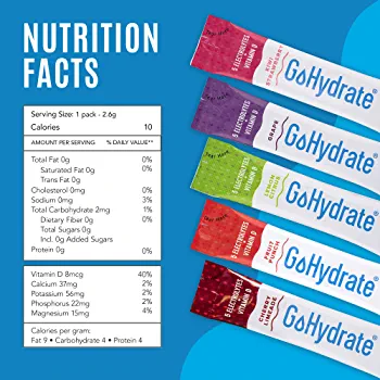 | nameOriginal | GoHydrate Electrolyte Drink Mix – A Naturally Flavored, Sugar Free, Hydration Powder (Mixed, 30 Count (Pack of 1)) |