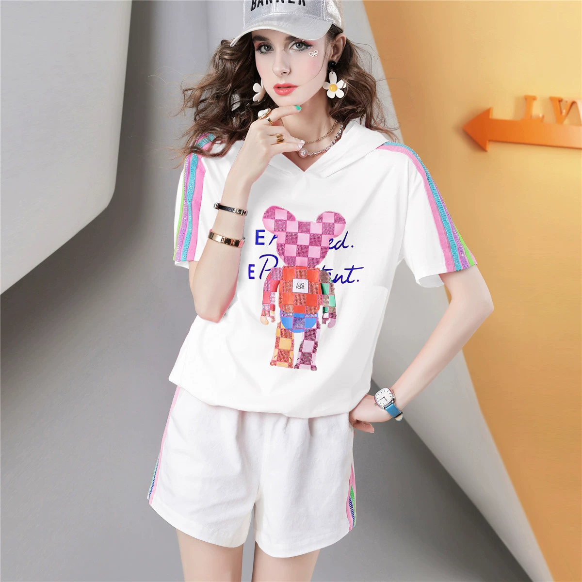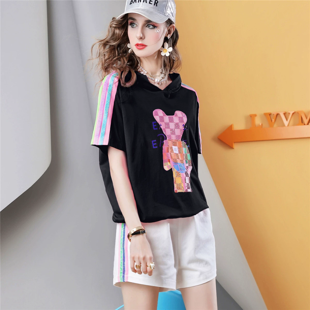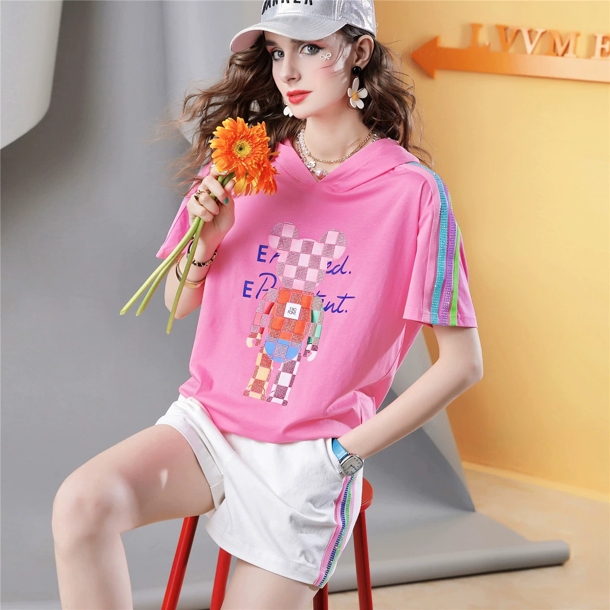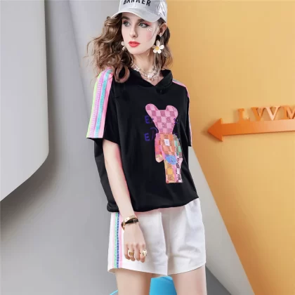 I832 printed top t-shirt with loose design and hot rhinestones
