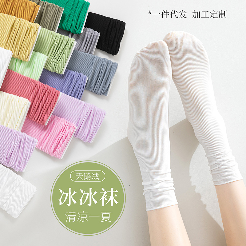 Ice Ice Socks Women's Summer Solid Color Mid-length Socks with Small Leather Shoes Piled Socks Summer Thin Velvet Ice Stockings