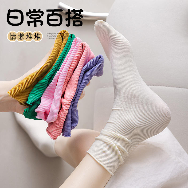 Ice Ice Socks Women’s Summer Solid Color Mid-length Socks with Small Leather Shoes Piled Socks Summer Thin Velvet Ice Stockings