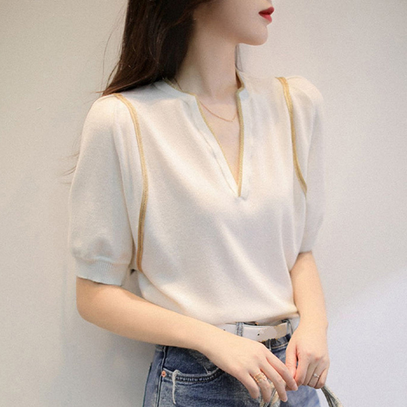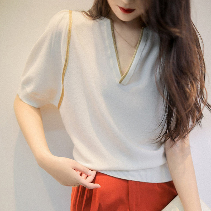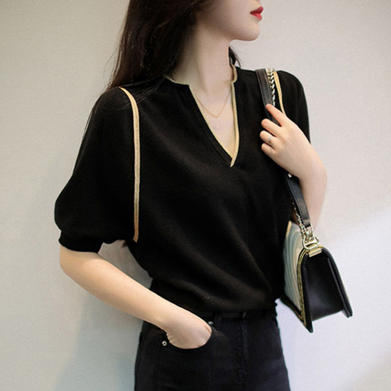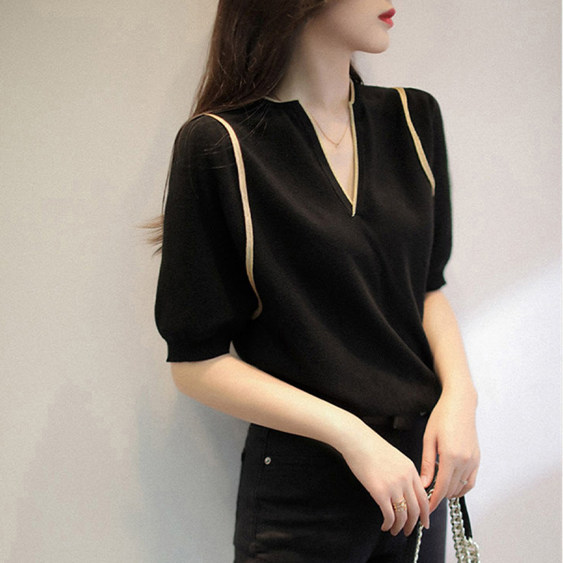 Ice silk black V-neck short sleeve T-shirt women's spring thin 2024 new contrast color temperament loose sweater top