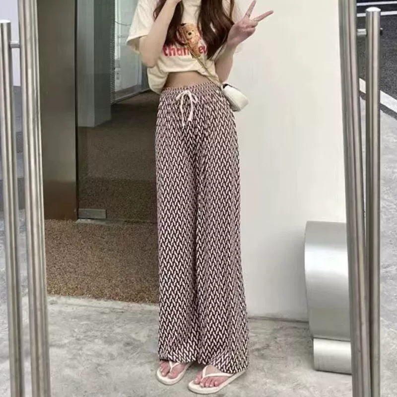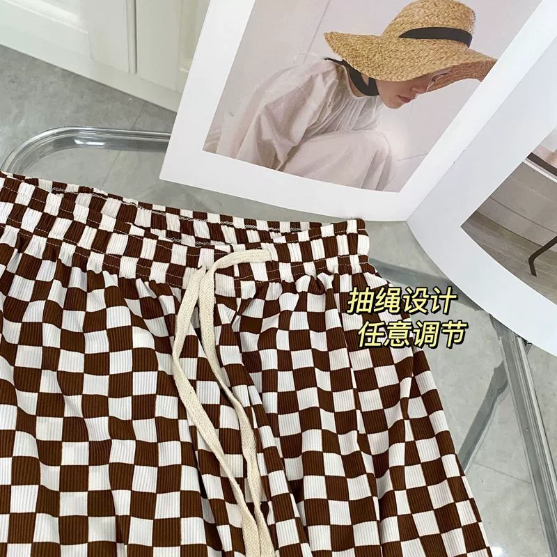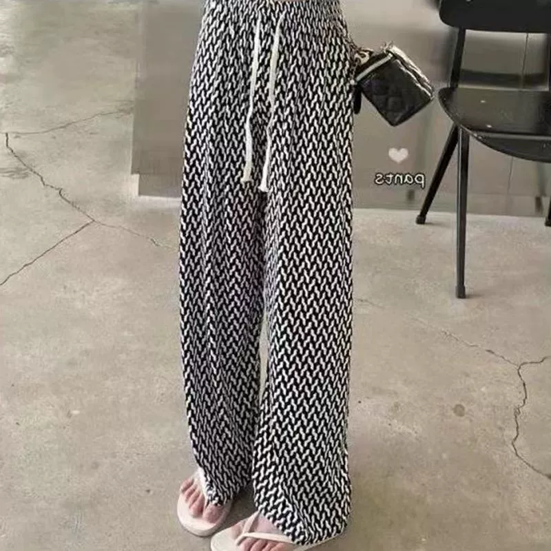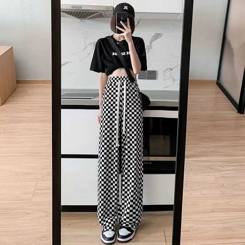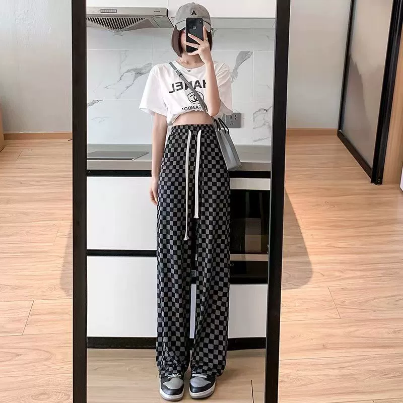 | nameOriginal | Ice silk checkerboard wide-leg pants for women summer thin high-waist drape loose straight pants black and white casual pants mopping the floor |
