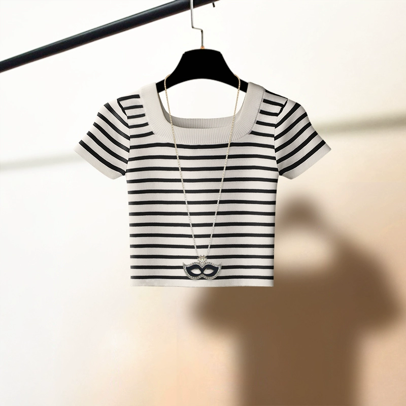 | nameOriginal | Ice silk French short square neck short-sleeved knitted T-shirt high waist big U collarbone tight slimming bottoming shirt tops for women summer |