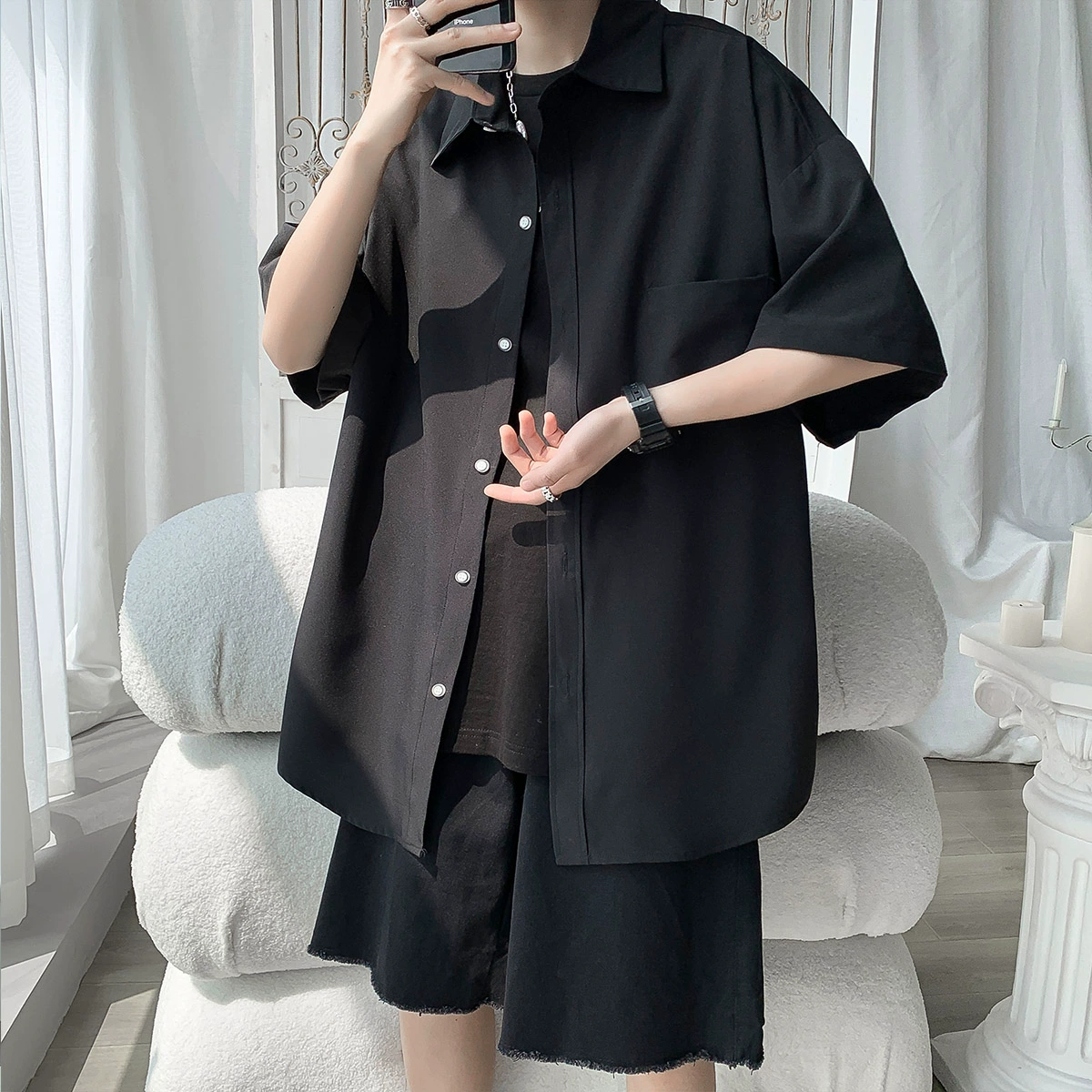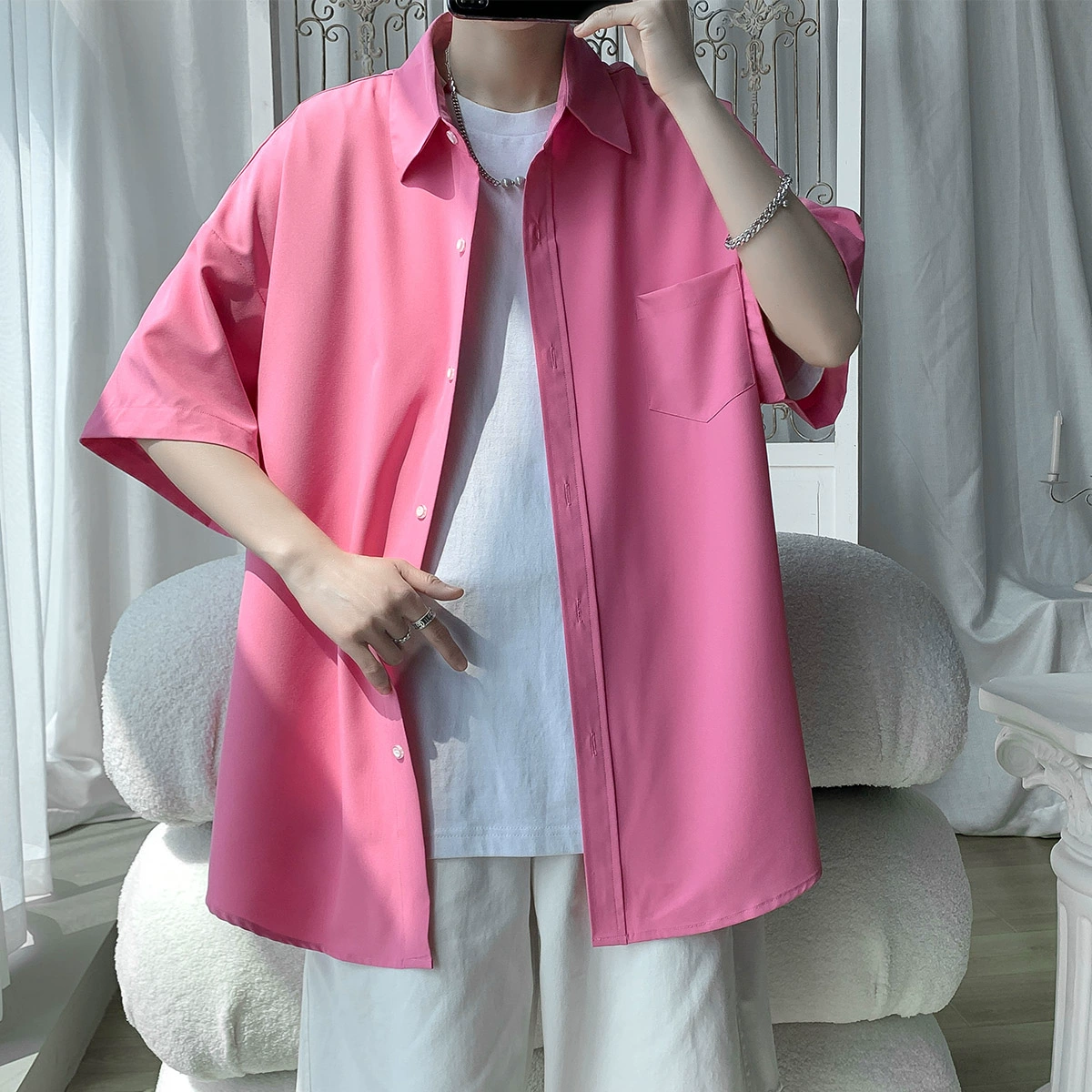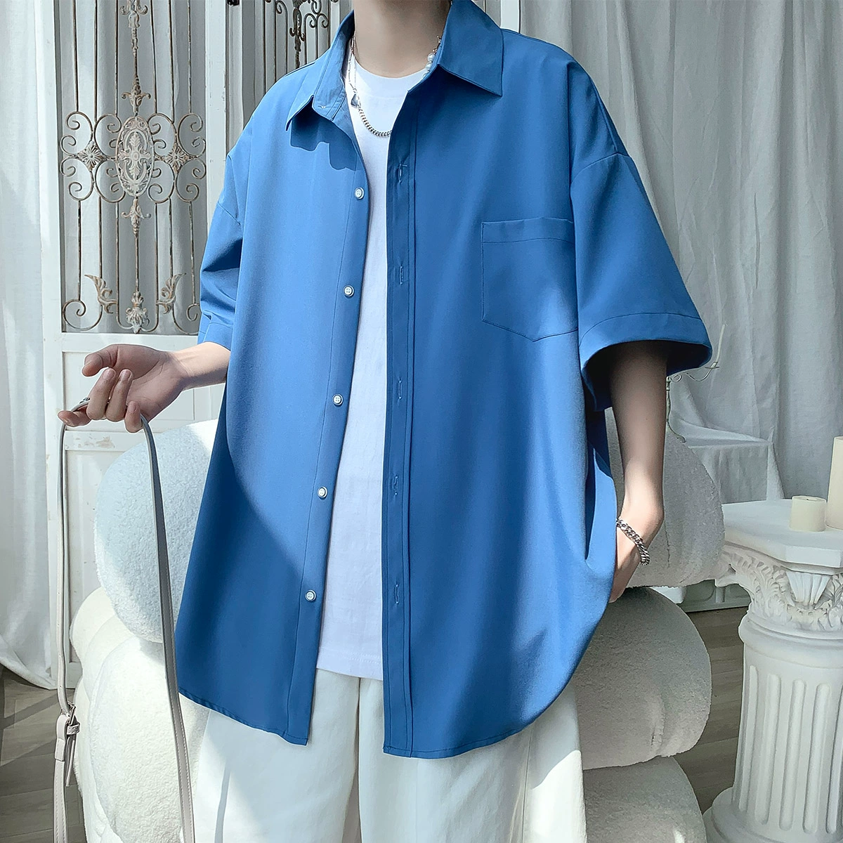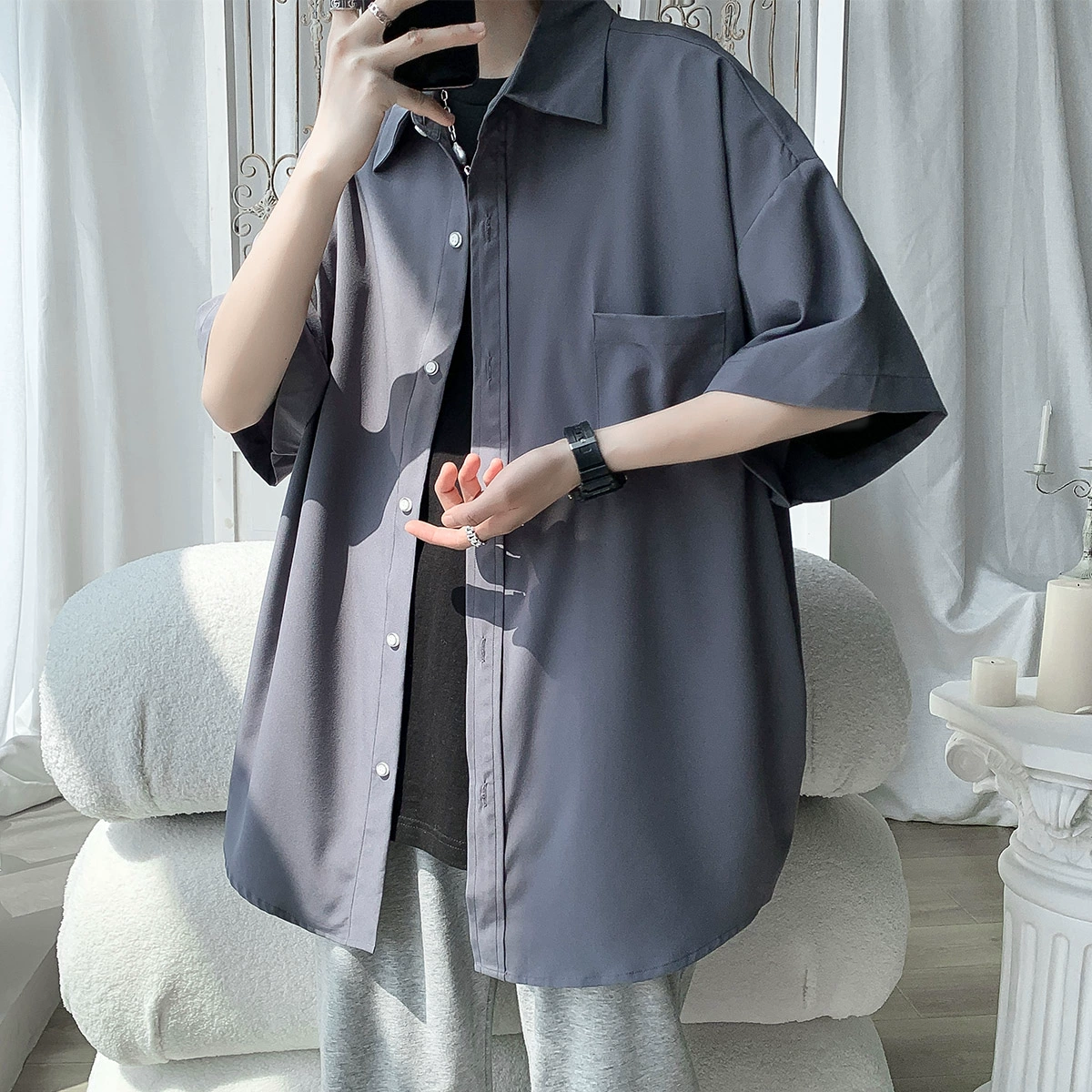 Ice silk half-sleeved student versatile and handsome drape shirt