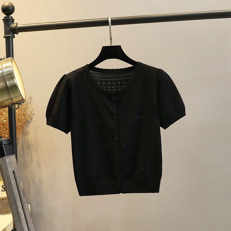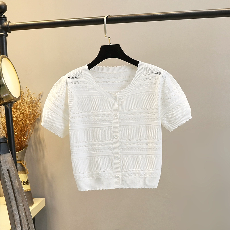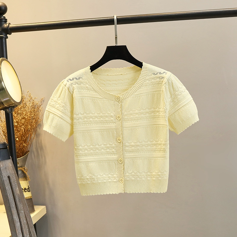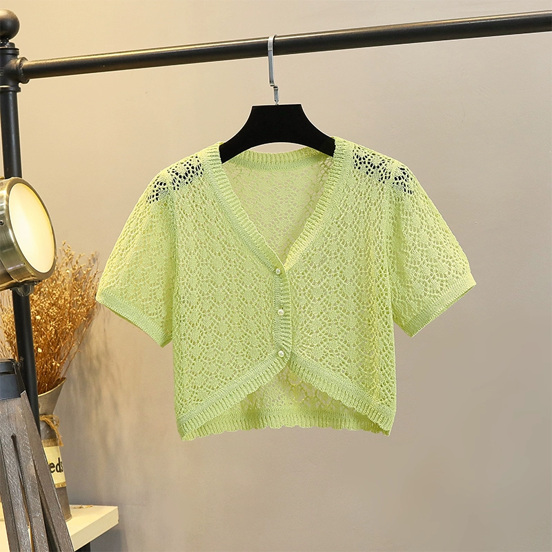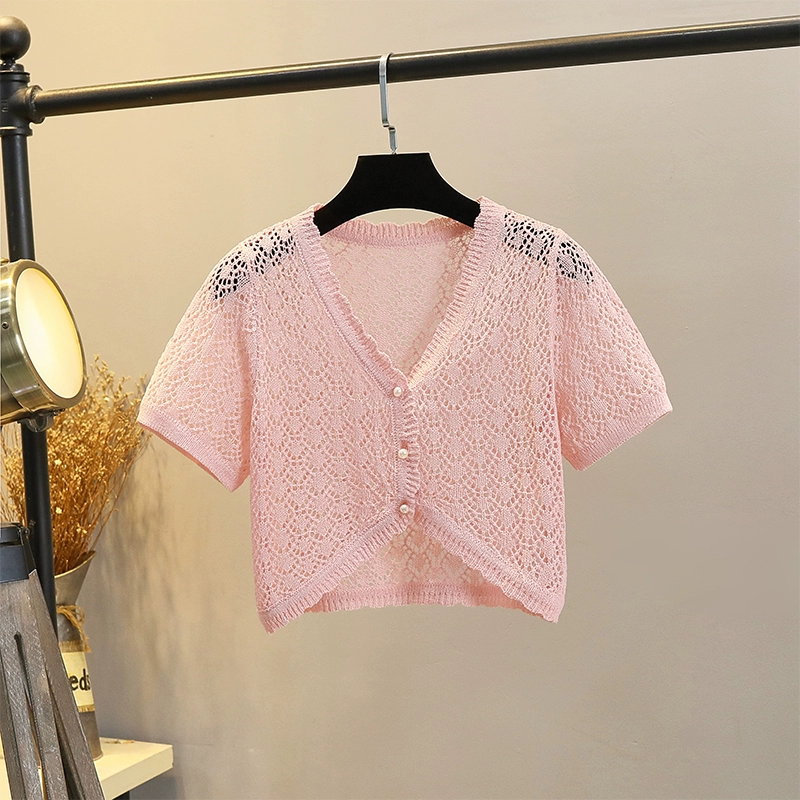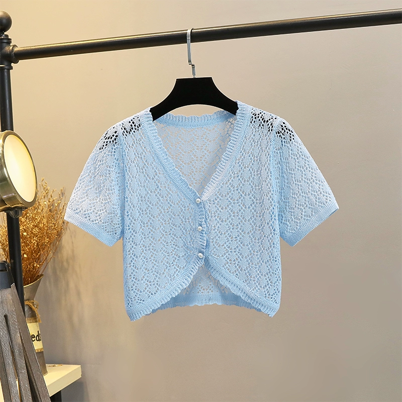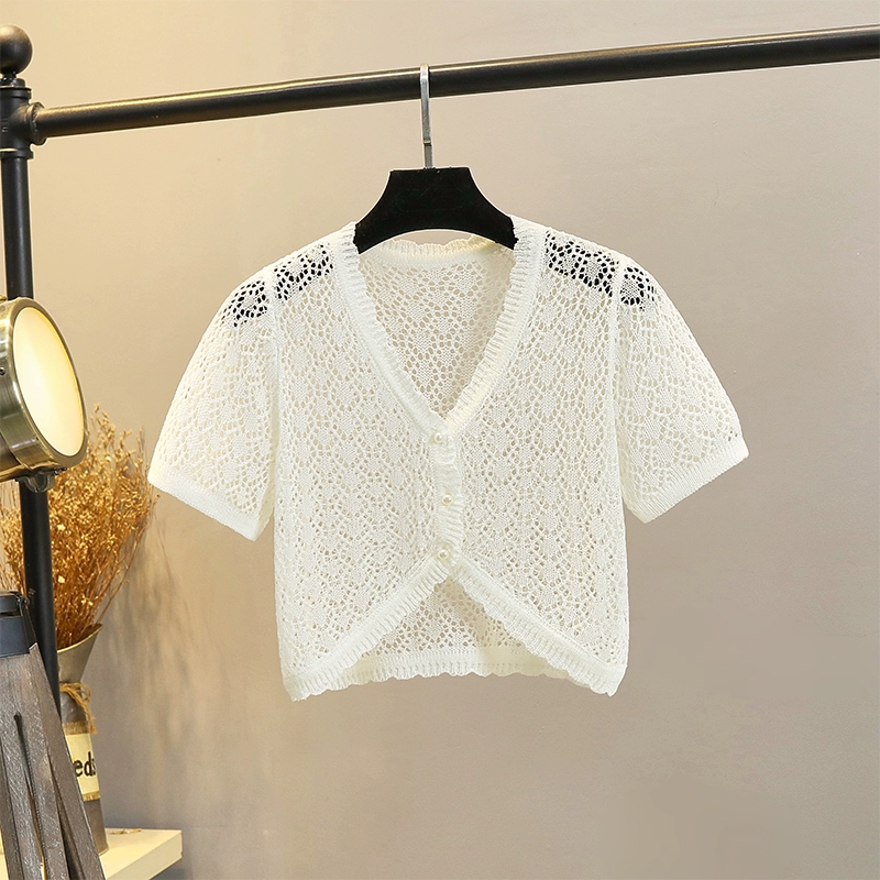 | nameOriginal | Ice silk hollow cardigan short-sleeved knitted shawl summer thin outer wear short high-waisted sun protection top for small women |