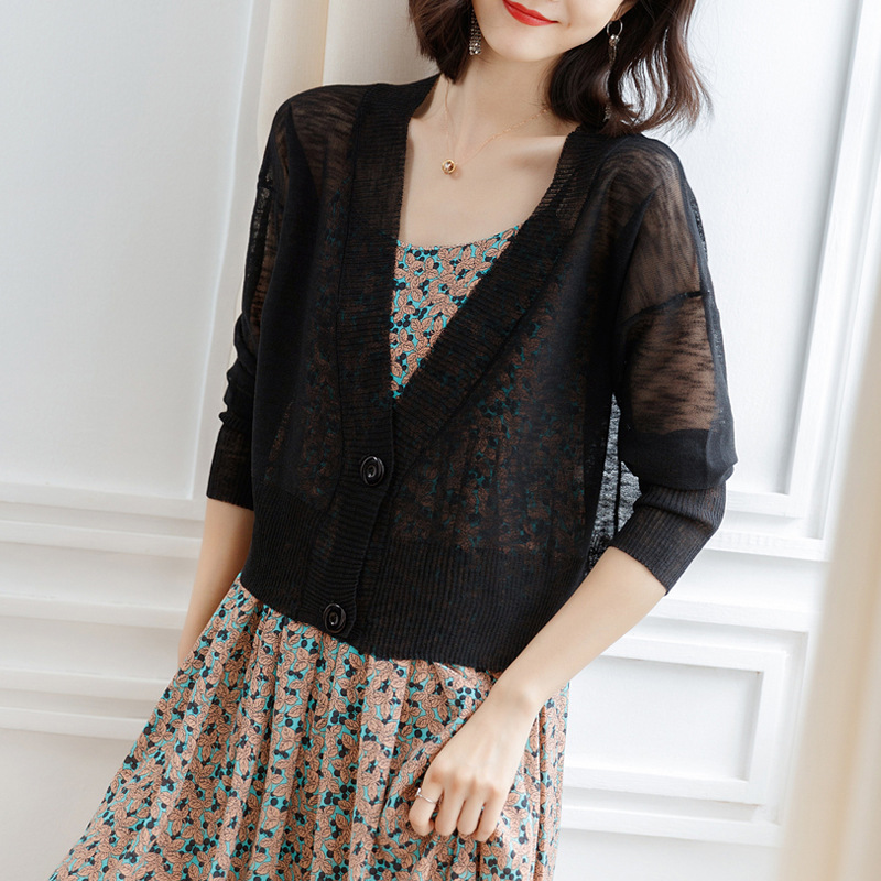| nameOriginal | Ice Silk knitted cardigan for women 2024 spring and summer new simple micro transparent outdoor air conditioning shirt sun protection shawl women's top |