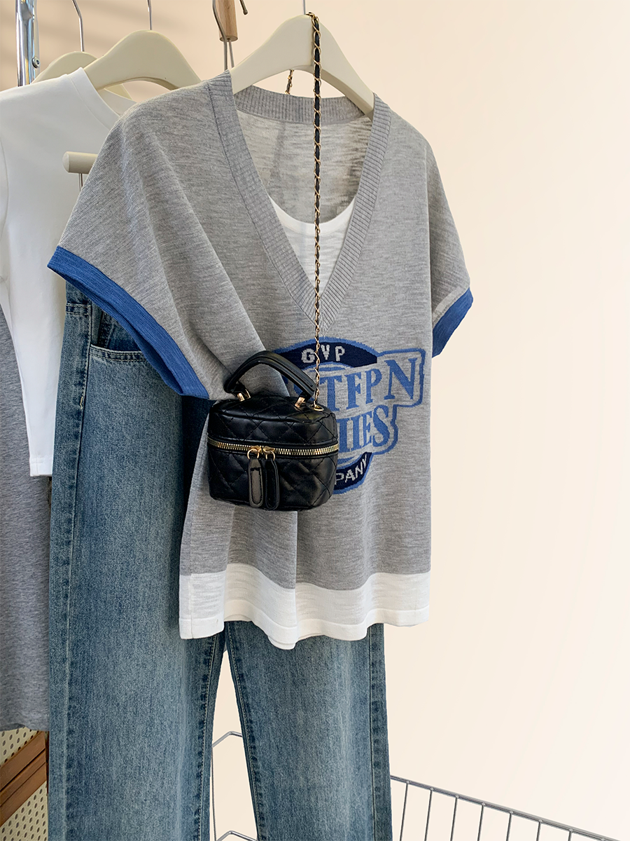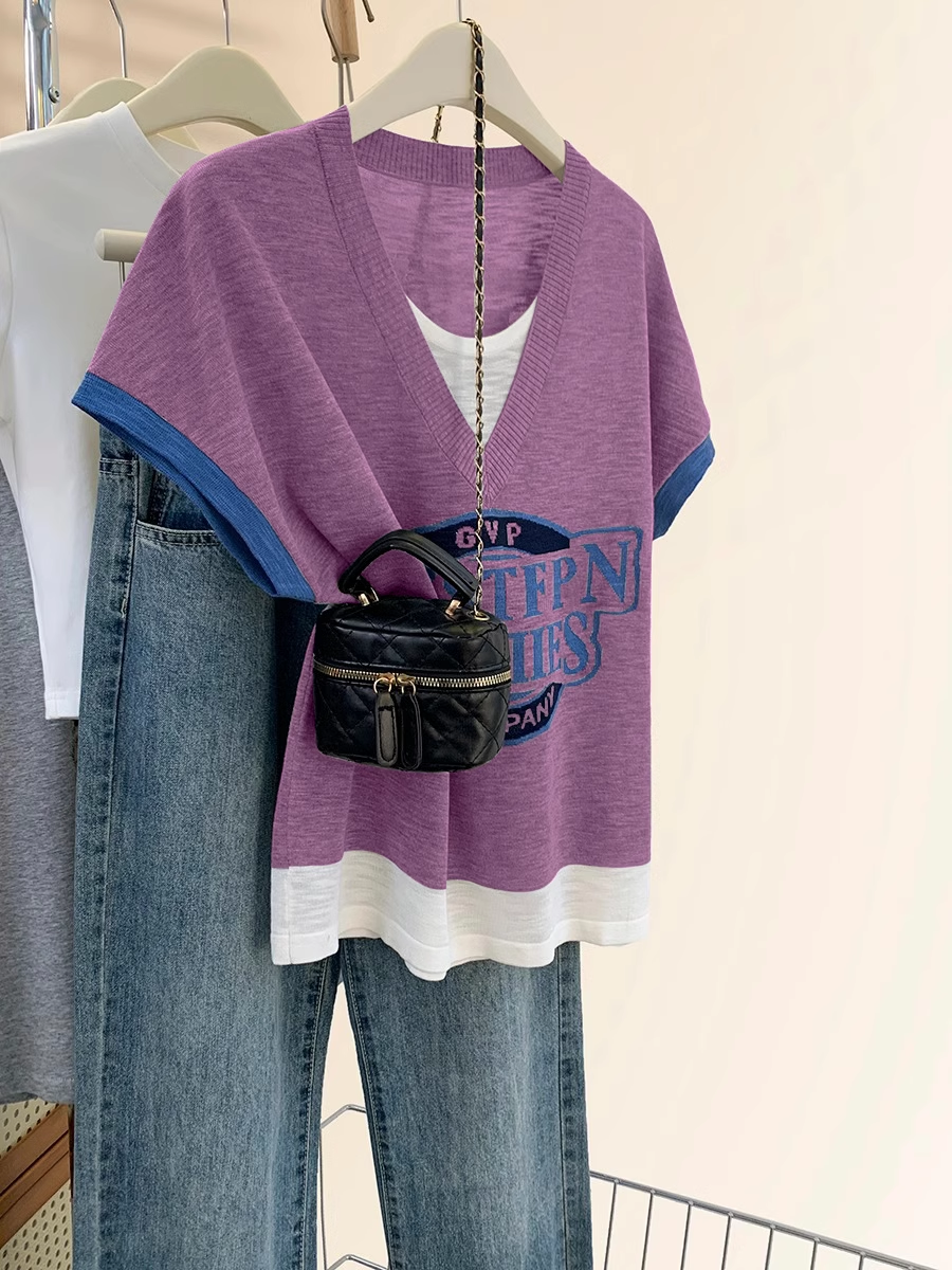 | nameOriginal | Ice silk knitted short-sleeved T-shirt for women summer 2024 new summer women's fake two-piece thin small flying sleeves right shoulder top |
