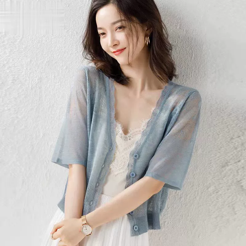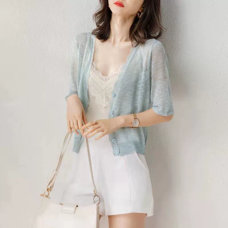 | nameOriginal | Ice silk knitted sun protection cardigan for women in summer with skirt suspender skirt shawl style top thin small jacket outer |