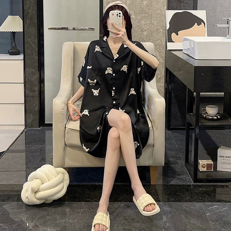 Ice Silk Nightgown Women’s Summer Short-Sleeved Pajamas 2024 New Large Size Thin Style Internet Celebrity Style Spring and Autumn Black Home Clothes