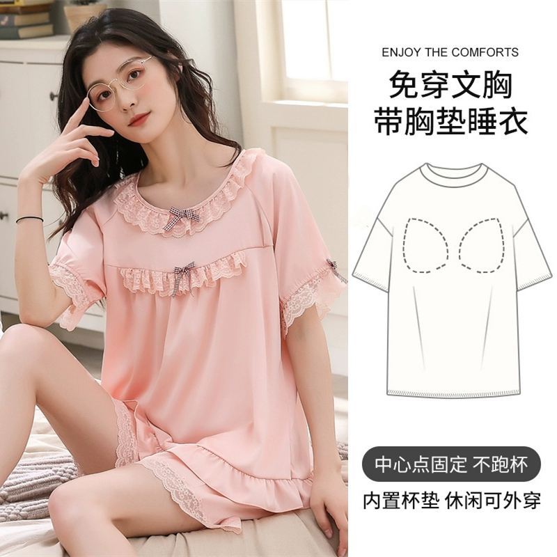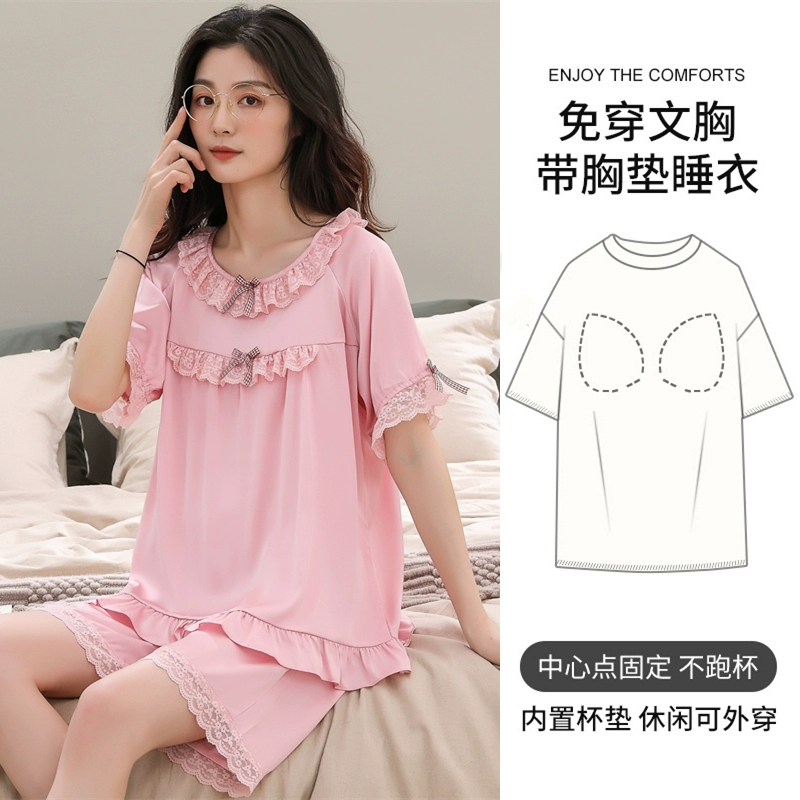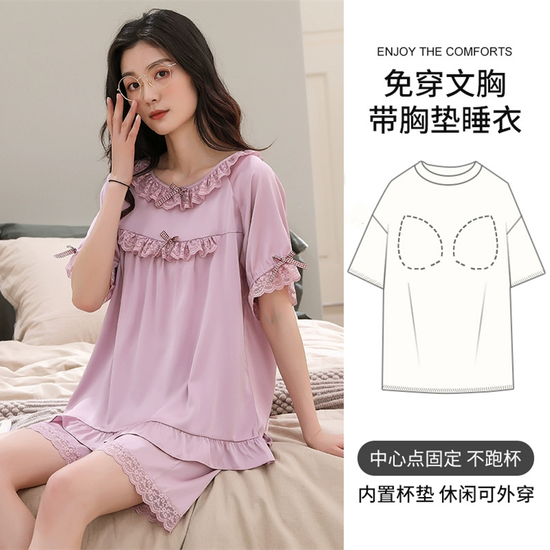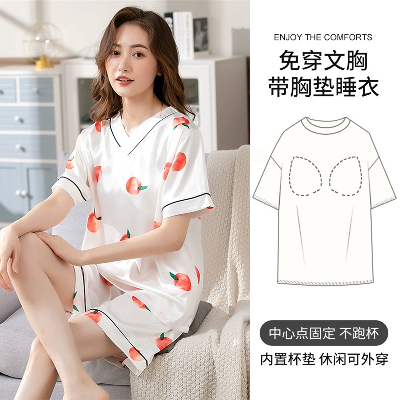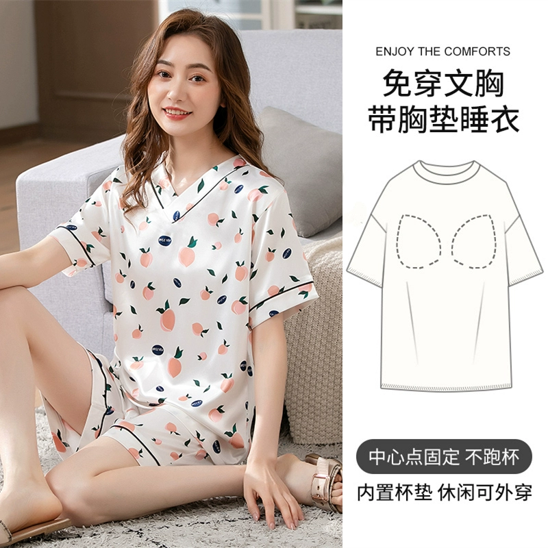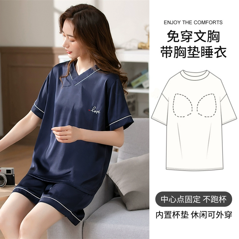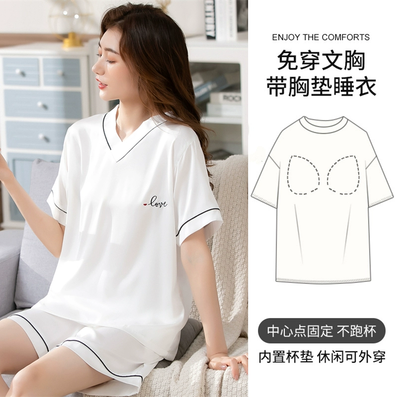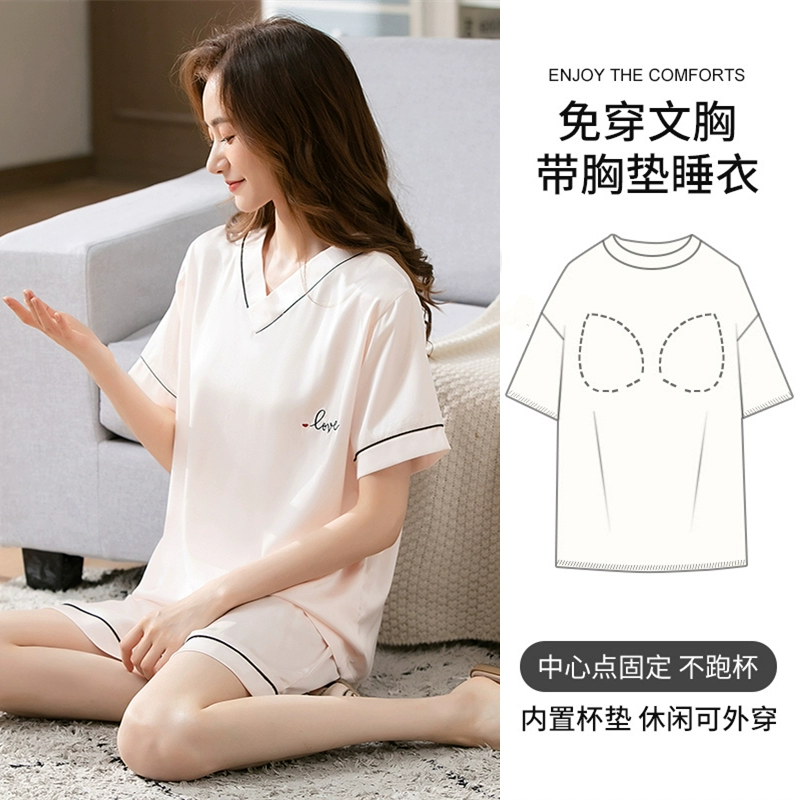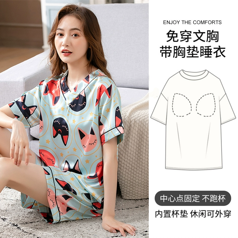 | nameOriginal | Ice silk pajamas for women summer with breast pads to prevent bumps and no need to wear bra short-sleeved simulated silk thin home wear set |