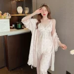 Ice Silk Pajamas Women’s Summer Internet Celebrity Sexy Lace Suspender Shorts Three-piece Set High-end Beautiful Girl Home Clothes