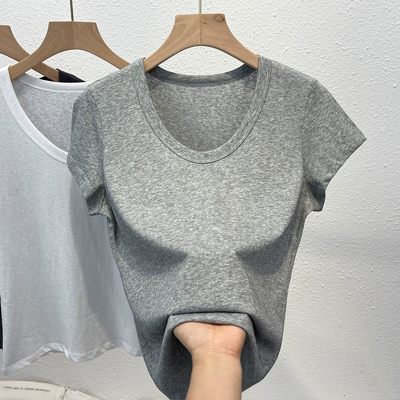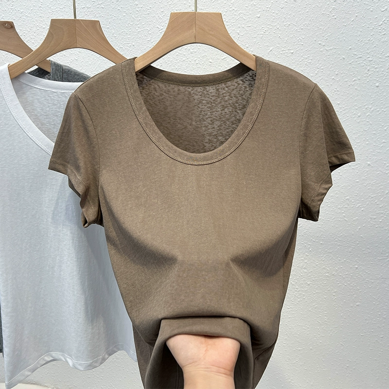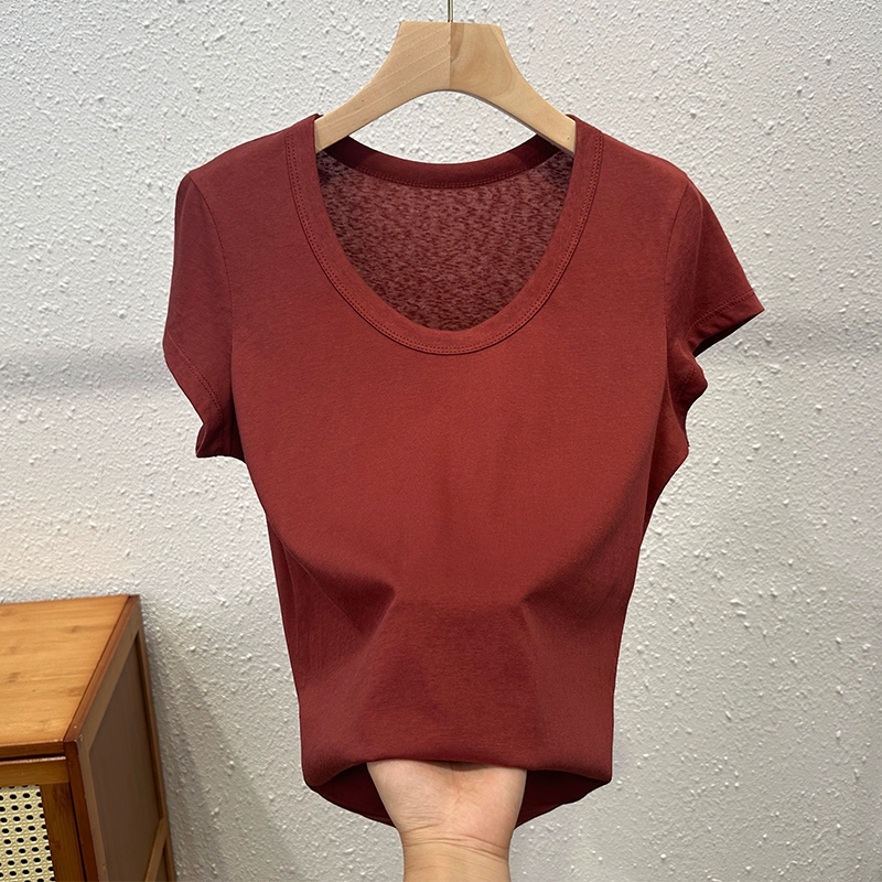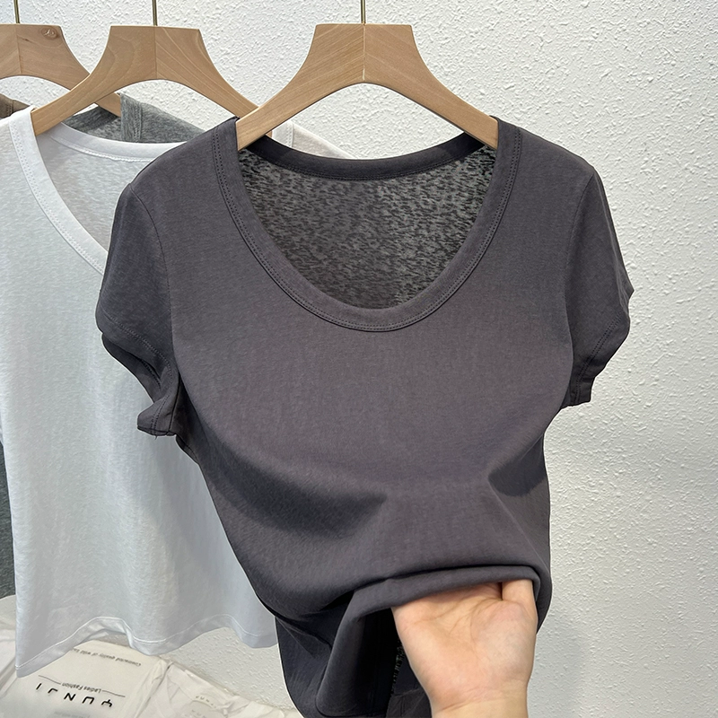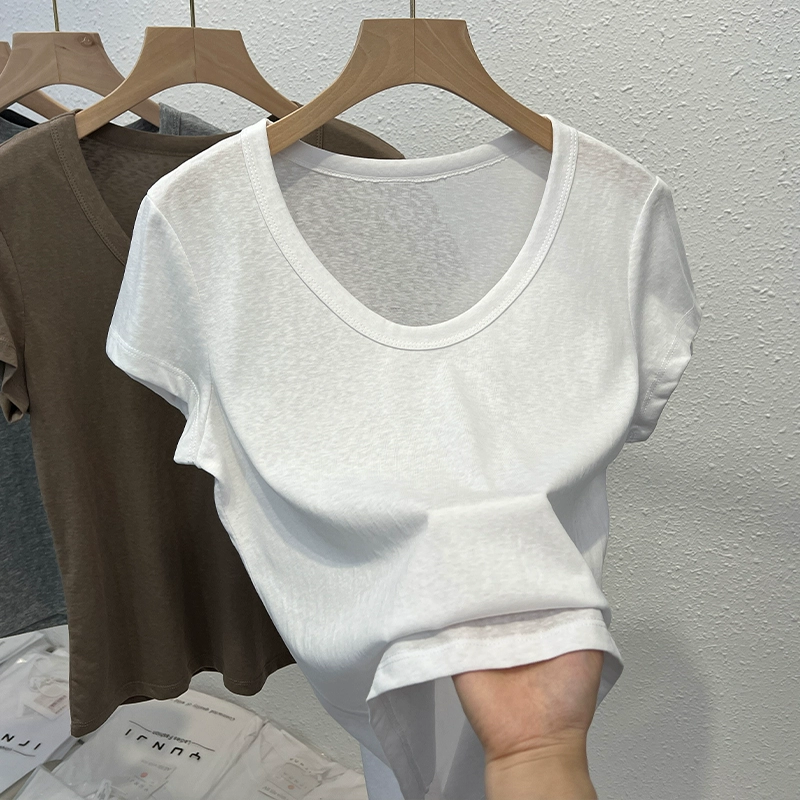 Ice silk pure cotton right shoulder short-sleeved T-shirt for women summer loose thin breathable large U-neck versatile t-shirt basic style top trendy