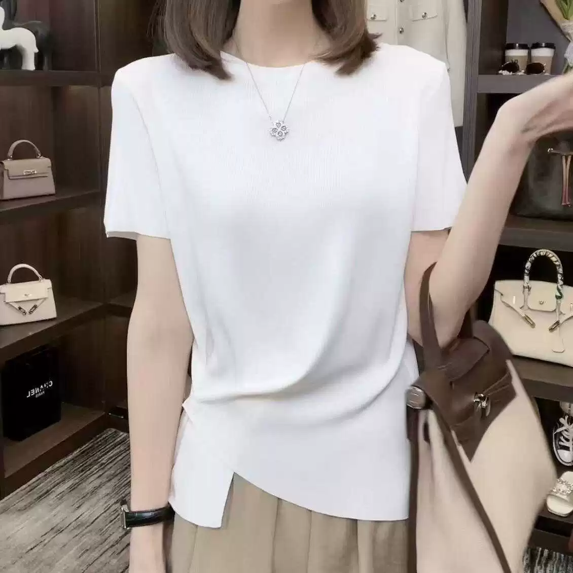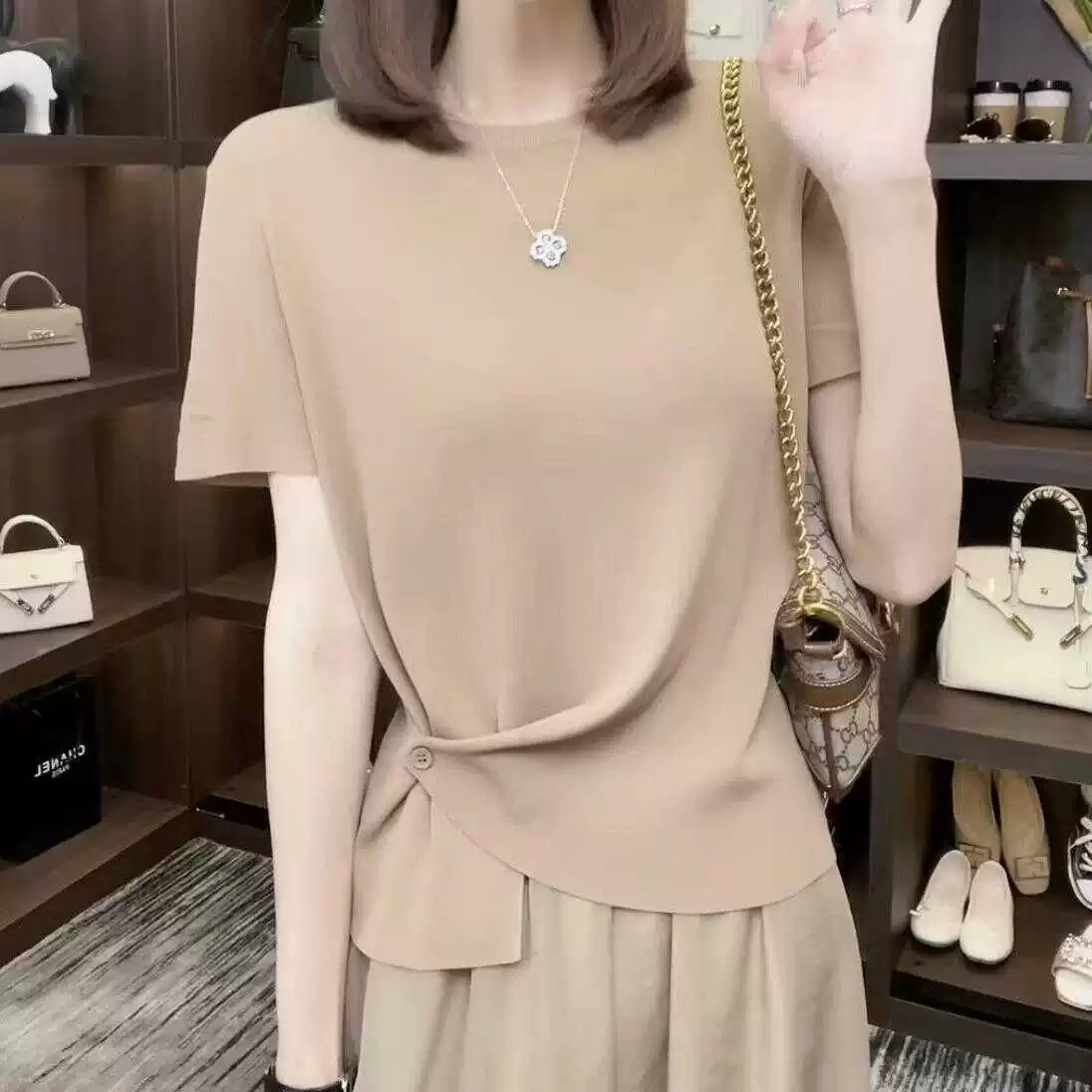 | nameOriginal | Ice silk right shoulder slim concealed button top sweater short sleeves |