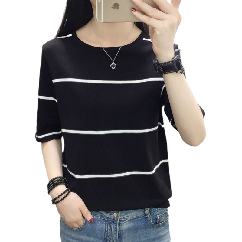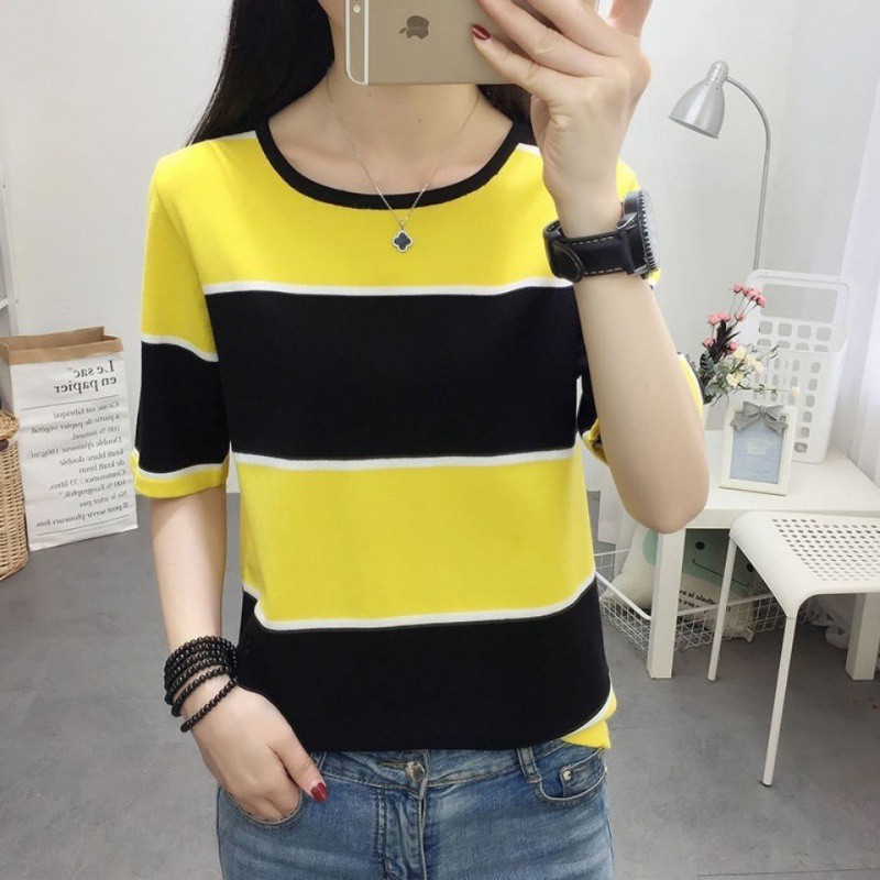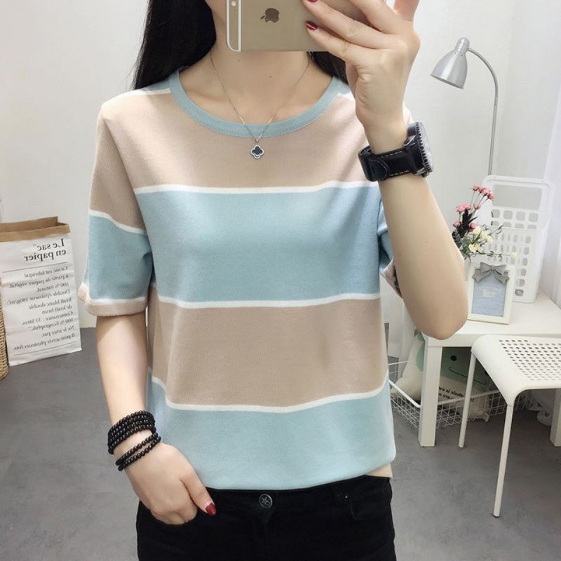 | nameOriginal | Ice Silk Shirt Women's 2024 Summer New Round Neck Loose Pullover Knitted Base Shirt All-match Striped Short-sleeved Top |
