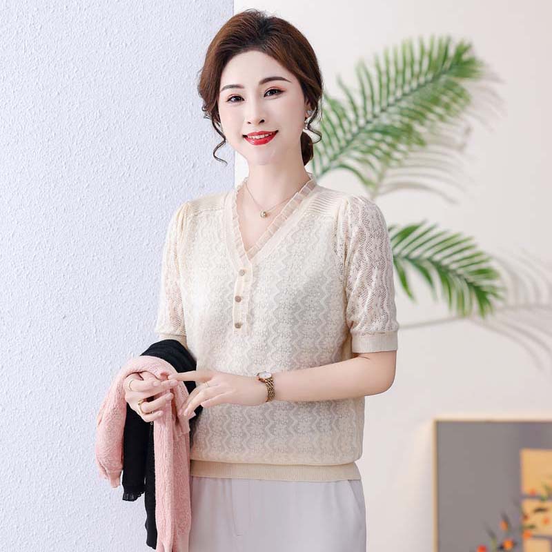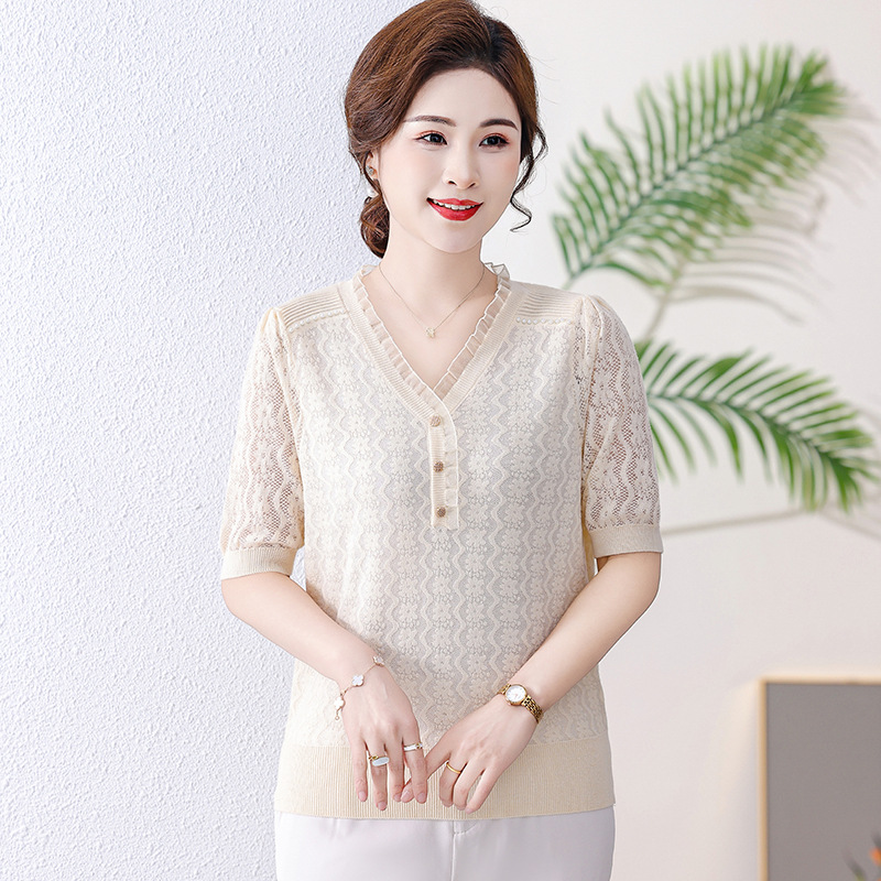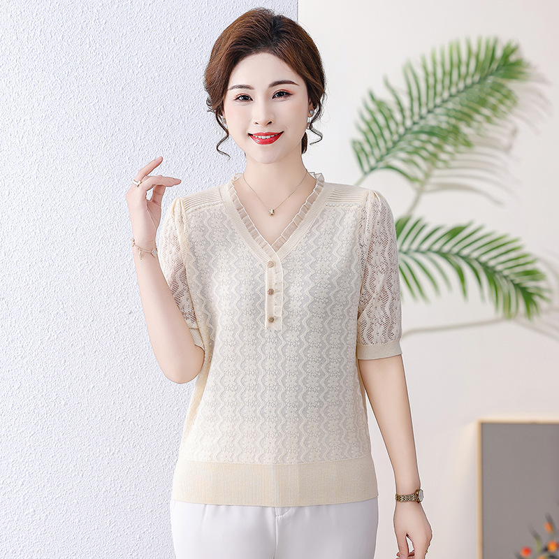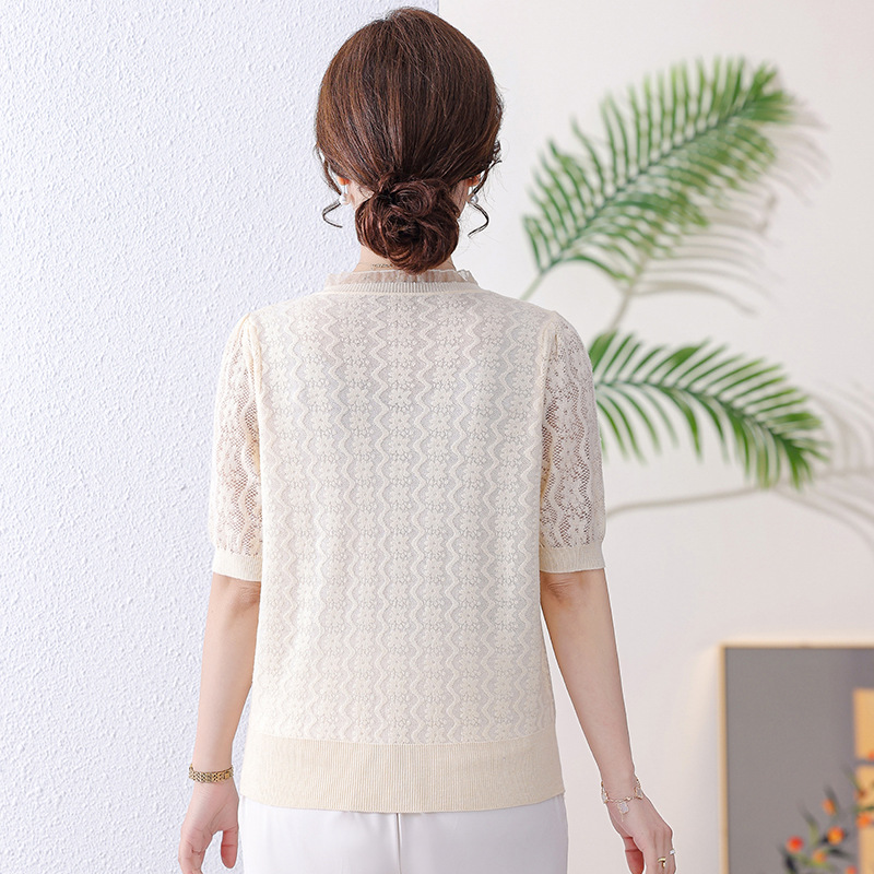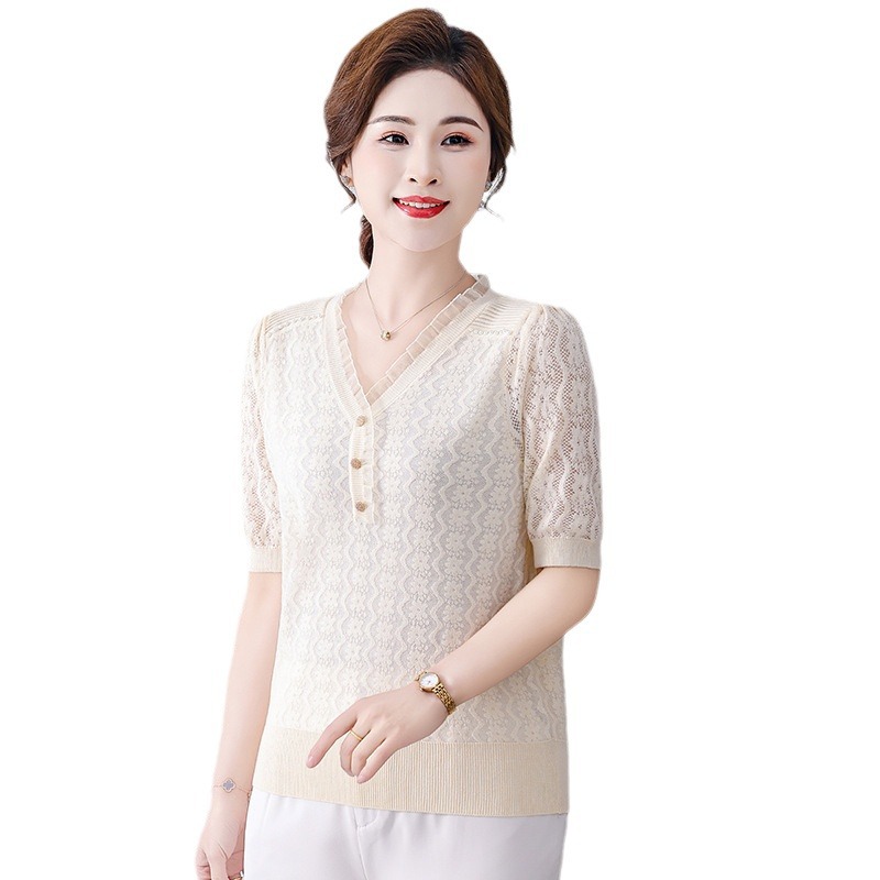 | nameOriginal | Ice Silk Short-Sleeve Shirt Women's 2024 New Arrival Western-Style Collar Mesh Jacquard Top Loose Slimming Belly-Covering Knitted Shirt |