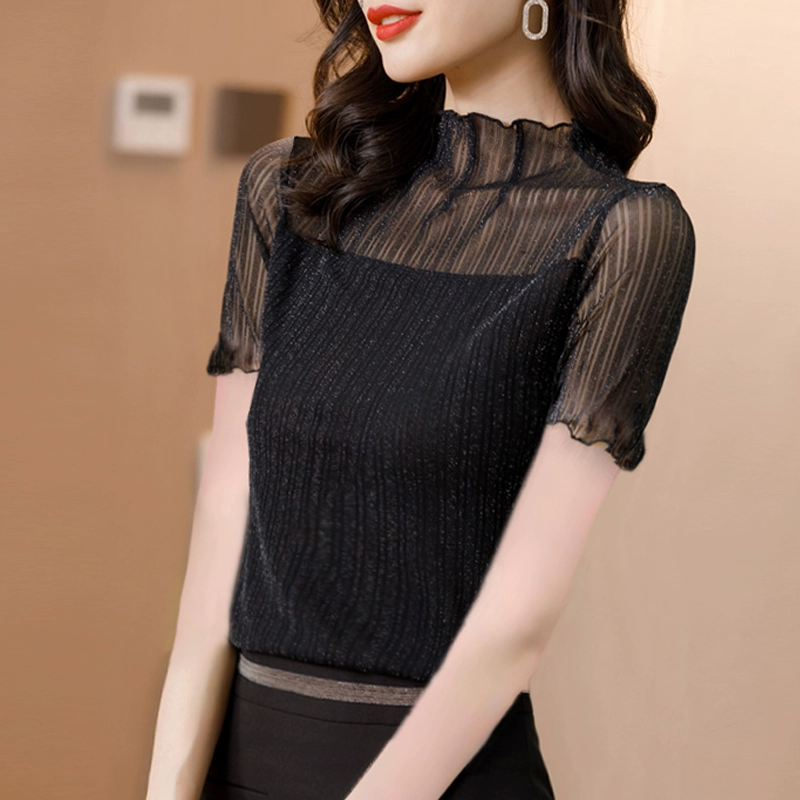 | nameOriginal | Ice silk short-sleeved T-shirt women's tops 2024 summer thin half turtleneck chiffon bright silk mesh lace slim bottoming shirt |