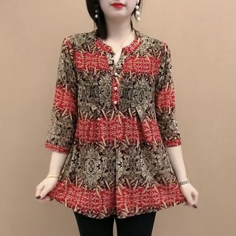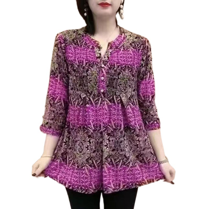Ice Silk Stretch Large Edition Shirt Round Neck Button Seven-point Sleeve 2024 Summer New Mid-length Loose Meat Covering Mother Shirt