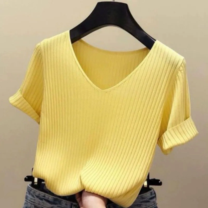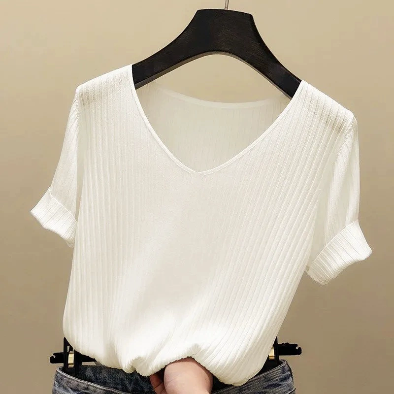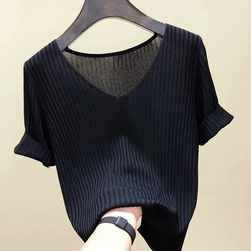 Ice silk t-shirt Korean style slim V-neck bottoming shirt short sleeves