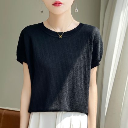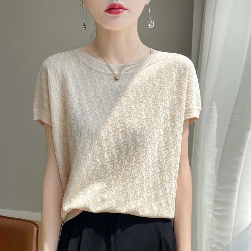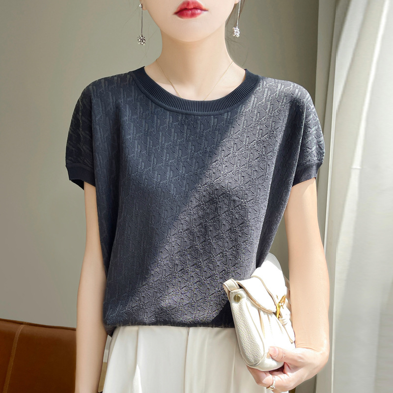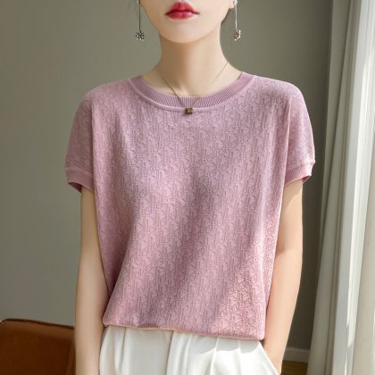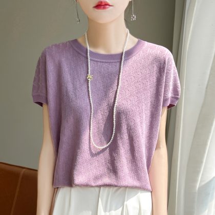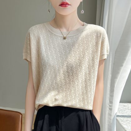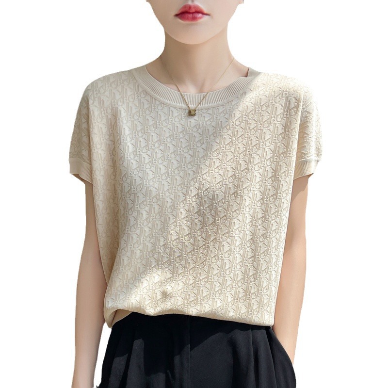 | nameOriginal | Ice Silk Women's Round Neck Short Sleeve Thin 2024 Summer New Style Elegant Pullover Jacquard Knitted Shirt Loose Top T-shirt |