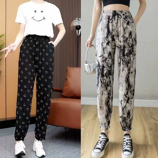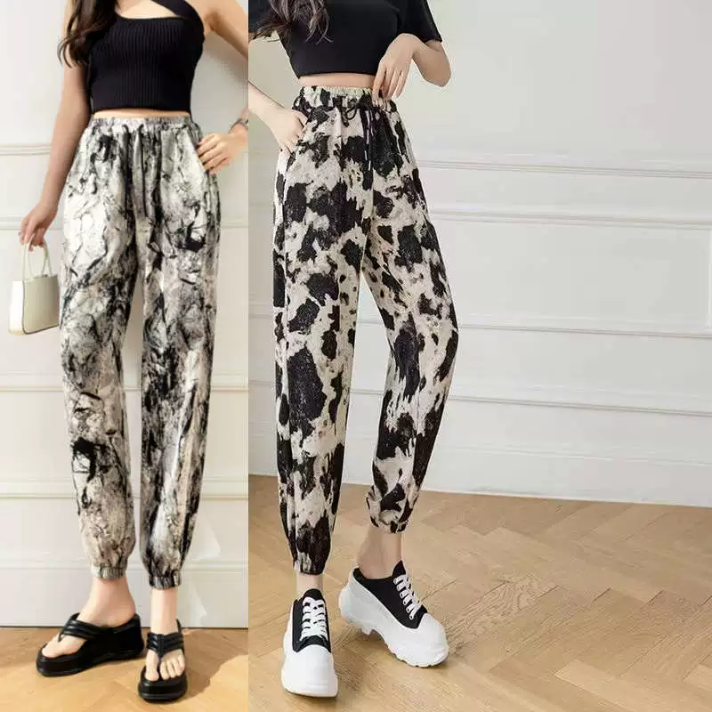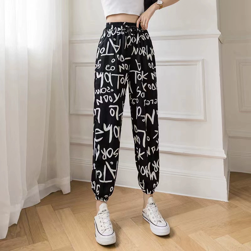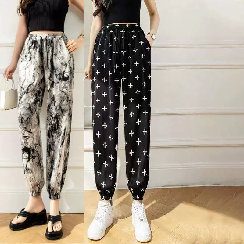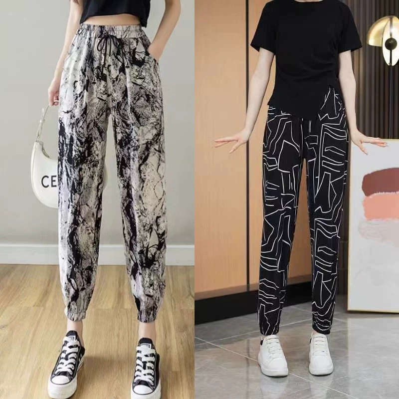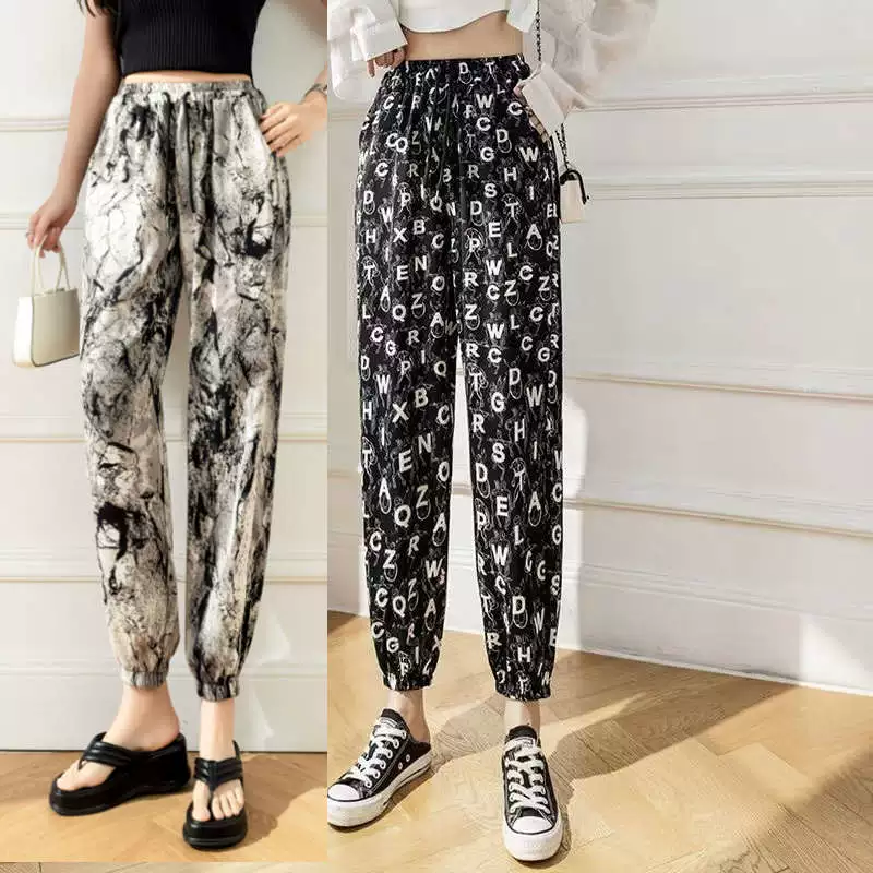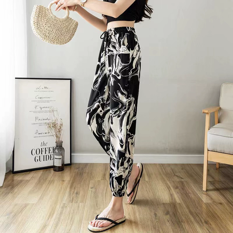 Ice Silk Women's Summer Loose Printed Foot-tie Sports Cool Pants