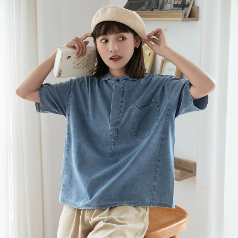 | nameOriginal | Ideal Island Denim Short Sleeve Shirt Women's 2024 Summer New Japanese Style Loose Small Fresh Design Pullover Shirt |