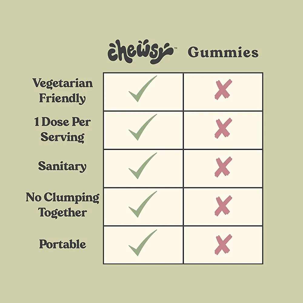 Chewsy is packaged in a smart way, with each chew individually wrapped for a more hygienic and safer alternative. Our chews are concentrated and deliver in one dose the equivalent of 2-6 gummies, so our 30-day supply pack is enough to help you achieve your goals.